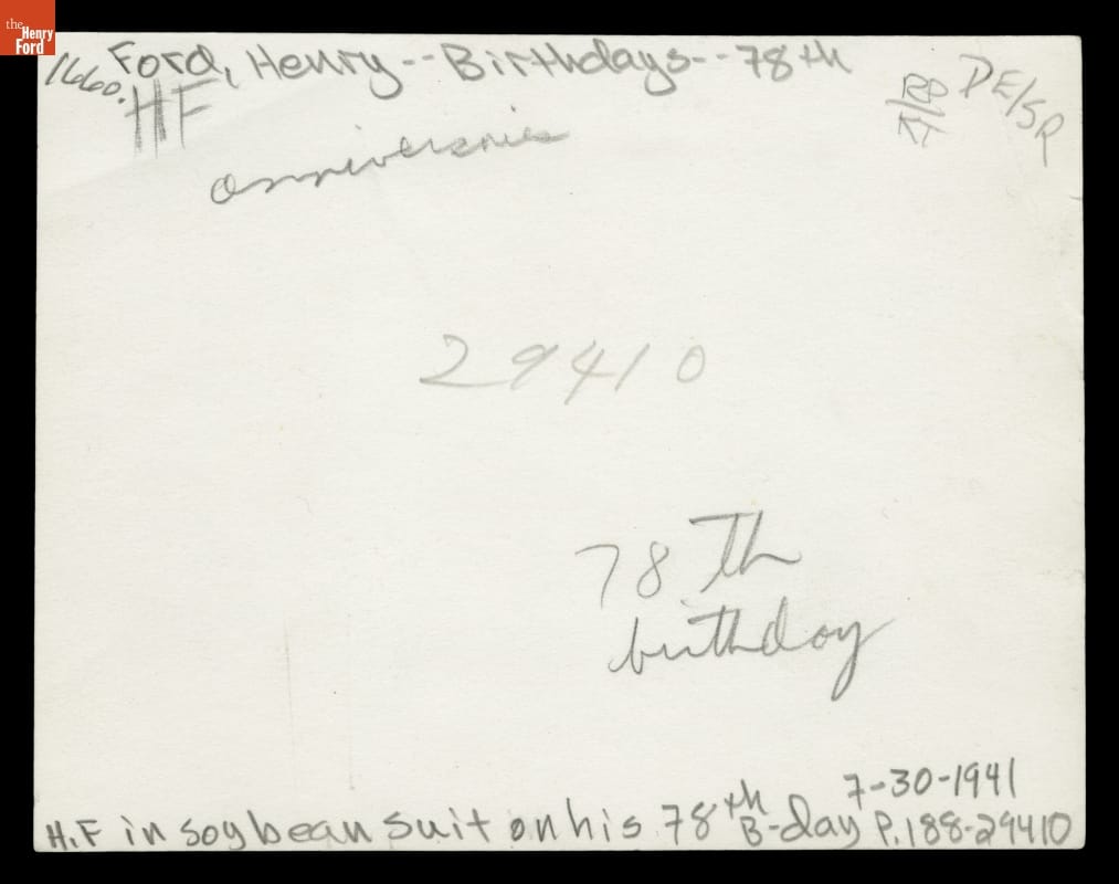 In the 1930s, Henry Ford's ambition to combine agriculture with industry resulted in large-scale soybean experimentation. Ford planted thousands of acres to the legume, which chemists used to create useful products including paints and plastics. He even commissioned a suit made with soybean protein fibers, which he modeled for this photograph taken on July 30, 1941 -- Ford's 78th birthday.