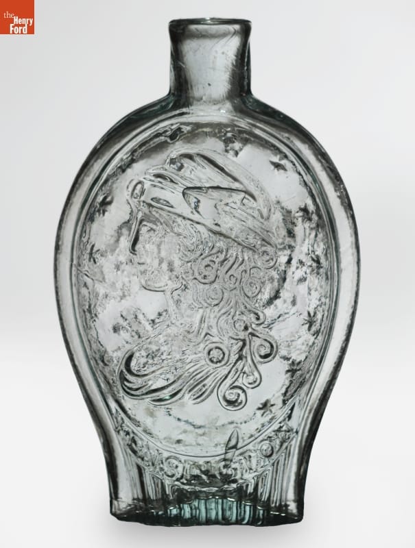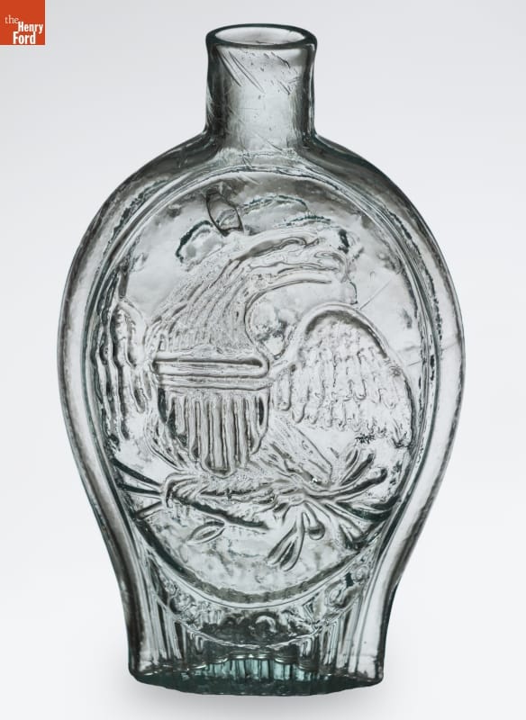 Glass factories in America began producing inexpensive, mold-formed flasks in the early 1800s. These figured flasks, often decorated with symbols of national pride or political or cultural affiliation, appealed to America's common man. Many flasks, like this one, contain traditional symbols representing America -- the image of an eagle on one side and Columbia wearing a liberty cap on the other.