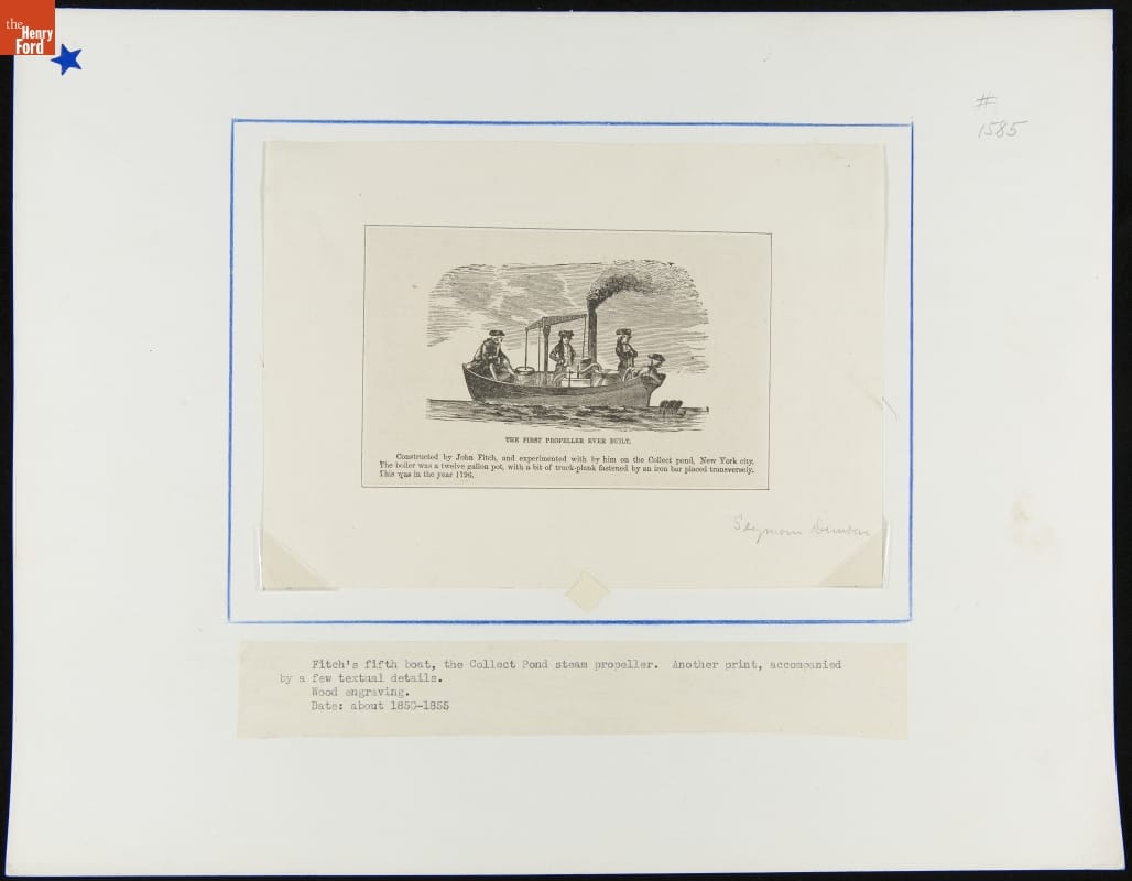 Connecticut-born entrepreneur and inventor John Fitch began building steam-powered boats in the 1780s. His first, Perseverance, was propelled by an unusual drivetrain of mechanized oars along both sides of the craft. The system was effective, but not particularly efficient. Fitch later experimented with screw propellers. He was unable to find commercial success with his designs.