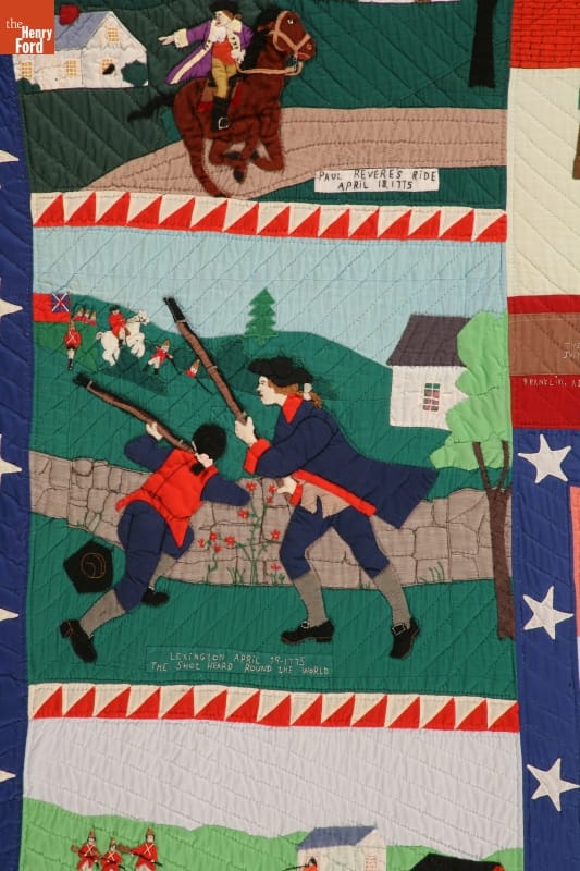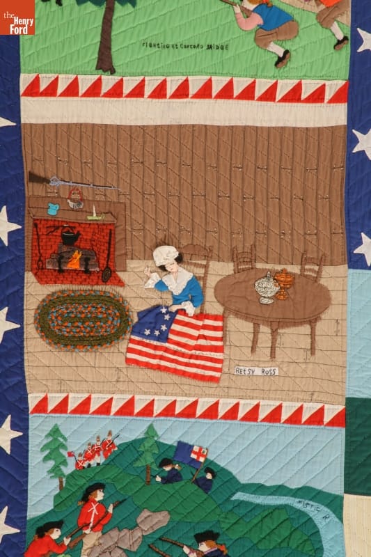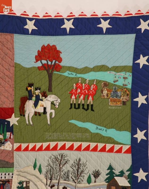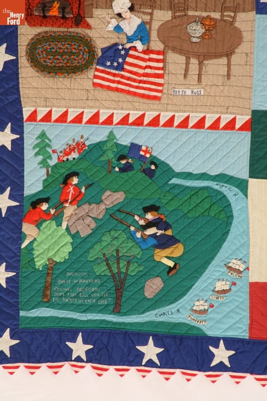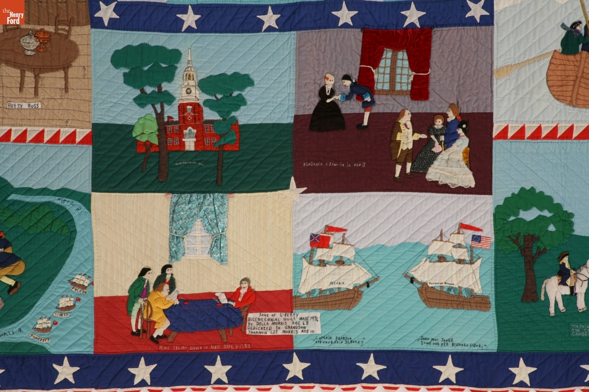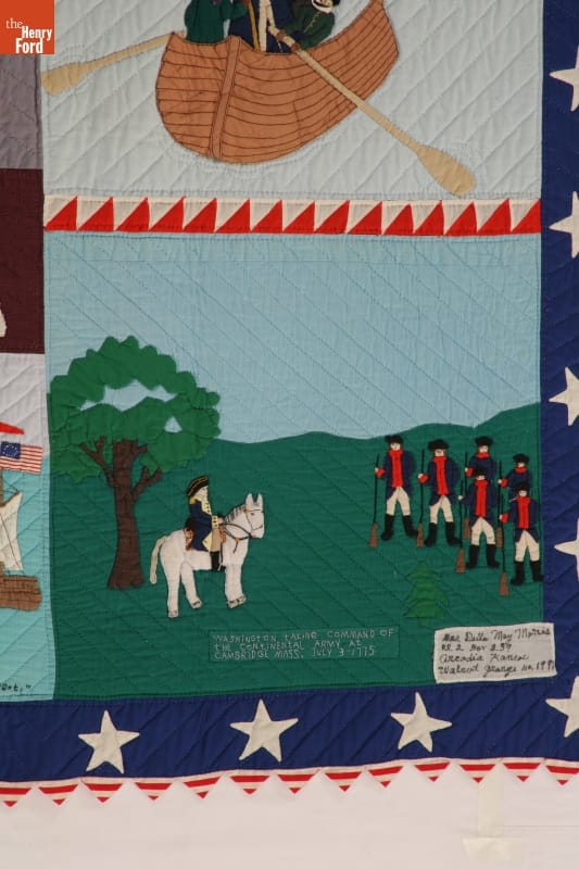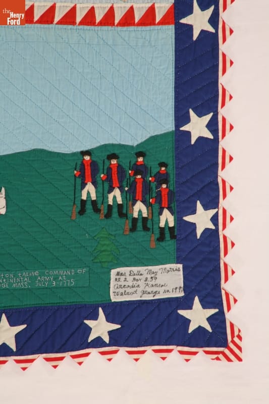 Della May Morris, a quilter all her life, created this quilt for the National Grange Bicentennial Quilt Contest. Morris and her family designed the 18 detailed Revolutionary War scenes, which earned a third-place finish.
