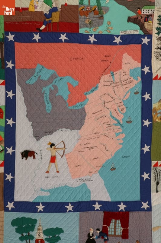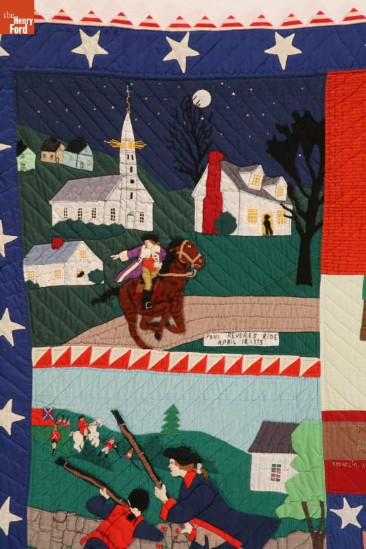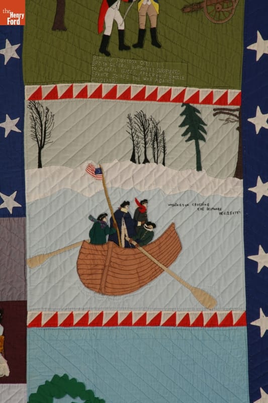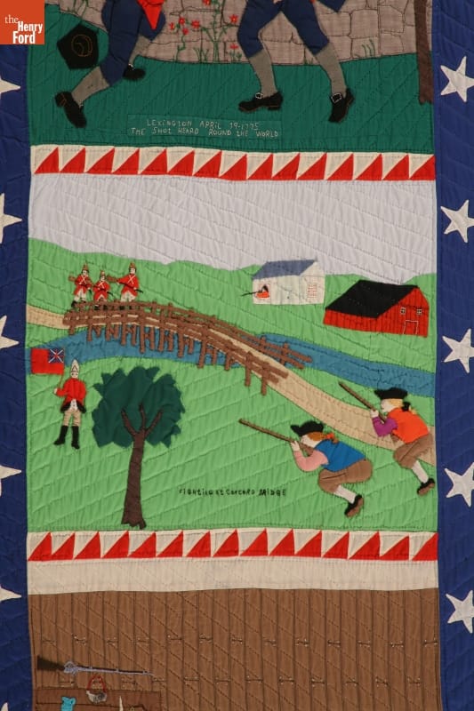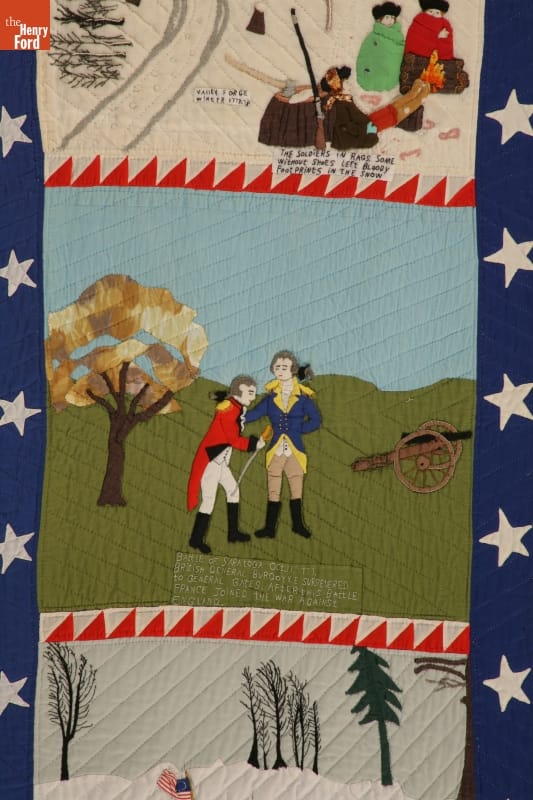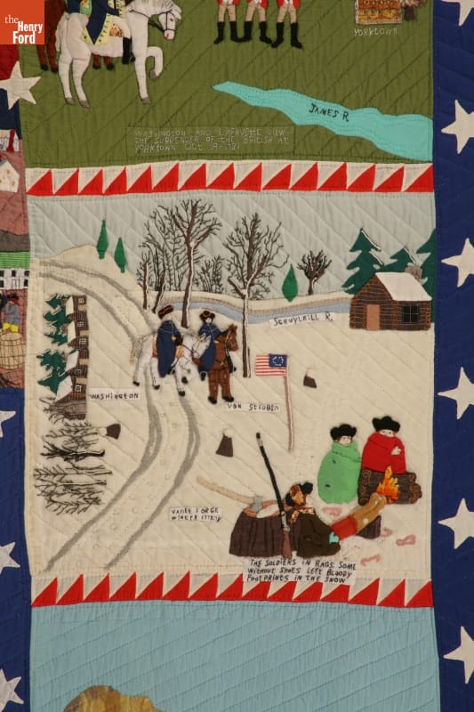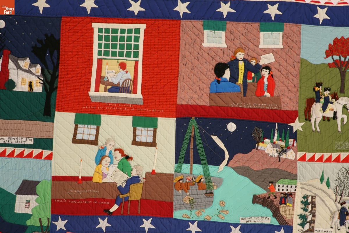 Della May Morris, a quilter all her life, created this quilt for the National Grange Bicentennial Quilt Contest. Morris and her family designed the 18 detailed Revolutionary War scenes, which earned a third-place finish.