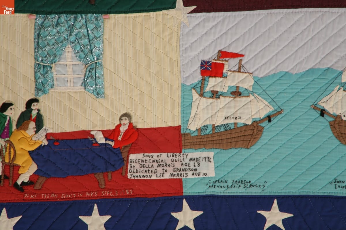 SONS OF LIBERTY/BICENTENNIAL QUILT MADE 1976/BY DELLA MORRIS AGE 68/DEDICATED TO GRANDSON/SHANNON LEE MORRIS AGE 10. Inscriptions in blocks beginning top left hand: 1) PAUL REVERE'S RIDE/APRIL 18, 1775; 2) THOMAS JEFFERSON/WRITING THE DECLARATION OF INDEPENDENCE; 3) PATRICK HENRY SPOKE MARCH 23, 1775/"GIVE ME LIBERTY OR GIVE ME DEATH"; 4) THEY SIGNED FOR FREEDOM/JULY - 1776/FRANKLIN, ADAMS,JEFFERSON, AND HANCOCK; 5) BOSTON TEA PARTY/DEC. 16, 1773; 6) WASHINGTON AND LAFAYETTE VIEW/THE SURRENDER OF THE BRITISH AT/YORKTOWN OCT. 19, 1781; 7) WASHINGTON/VON STEUBEN/SCHUYLKILL R./VALLEY FORGE/WINTER 1777-1778/THE SOLDIERS IN RAGS. SOME WITHOUT SHOES LEFT BLOODY FOOTPRINTS IN THE SNOW; 8) BATTLE OF SARATOGA OCT. 17, 1777/BRITISH GENERAL BURGOYNE SURRENDERED/TO GENERAL GATES. AFTER THIS BATTLE/FRANCE JOINED THE WAR AGAINST/ENGLAND; 9) WASHINGTON CROSSING/THE DELAWARE/DEC.25, 1777; 10) WASHINGTON TAKING COMMAND OF/THE CONTINENTAL ARMY AT/CAMBRIDGE MASS. JULY 3, 1775/MRS. DELLA MAY MORRIS/ RR 2 BOX 239/ARCADIA KANSAS/WALNUT GRANGE NO. 199; 11)BENJAMIN FRANKLIN IN PARIS; 12) SERAPIS/BONHOMME RICHARD/CAPTAIN PEARSON/"HAS YOUR SHIP STRUCK?"/JOHN PAUL JONES/"I HAVE NOT YET BEGUN TO FIGHT";/13) PEACE TREATY SIGNED IN PARIS SEPT. 3, 1783/14) INDEPENDENCE HALL; 15) JUNE 17, 1775/BATTLE OF BUNKER HILL/COLONEL PRESCOTT, "DON'T FIRE TILL YOU SEE THE WHITES OF THEIR EYES"/CHARLES RIVER/SOMERSET/LIVELY/FALCON; 16) BETSY ROSS; 17) FIGHTING AT CONCORD BRIDGE; 18) LEXINGTON APRIL 19, 1775/THE SHOT HEARD ROUND THE WORLD.