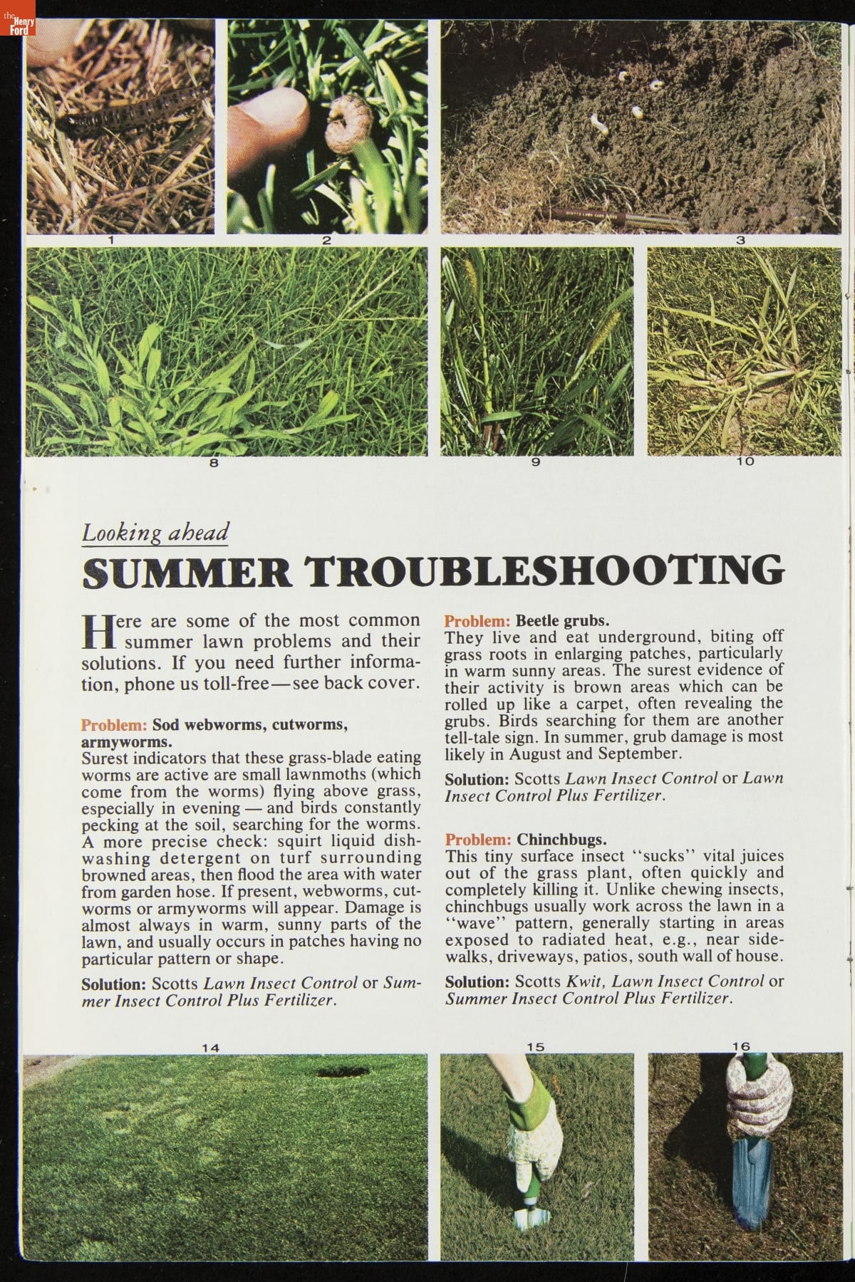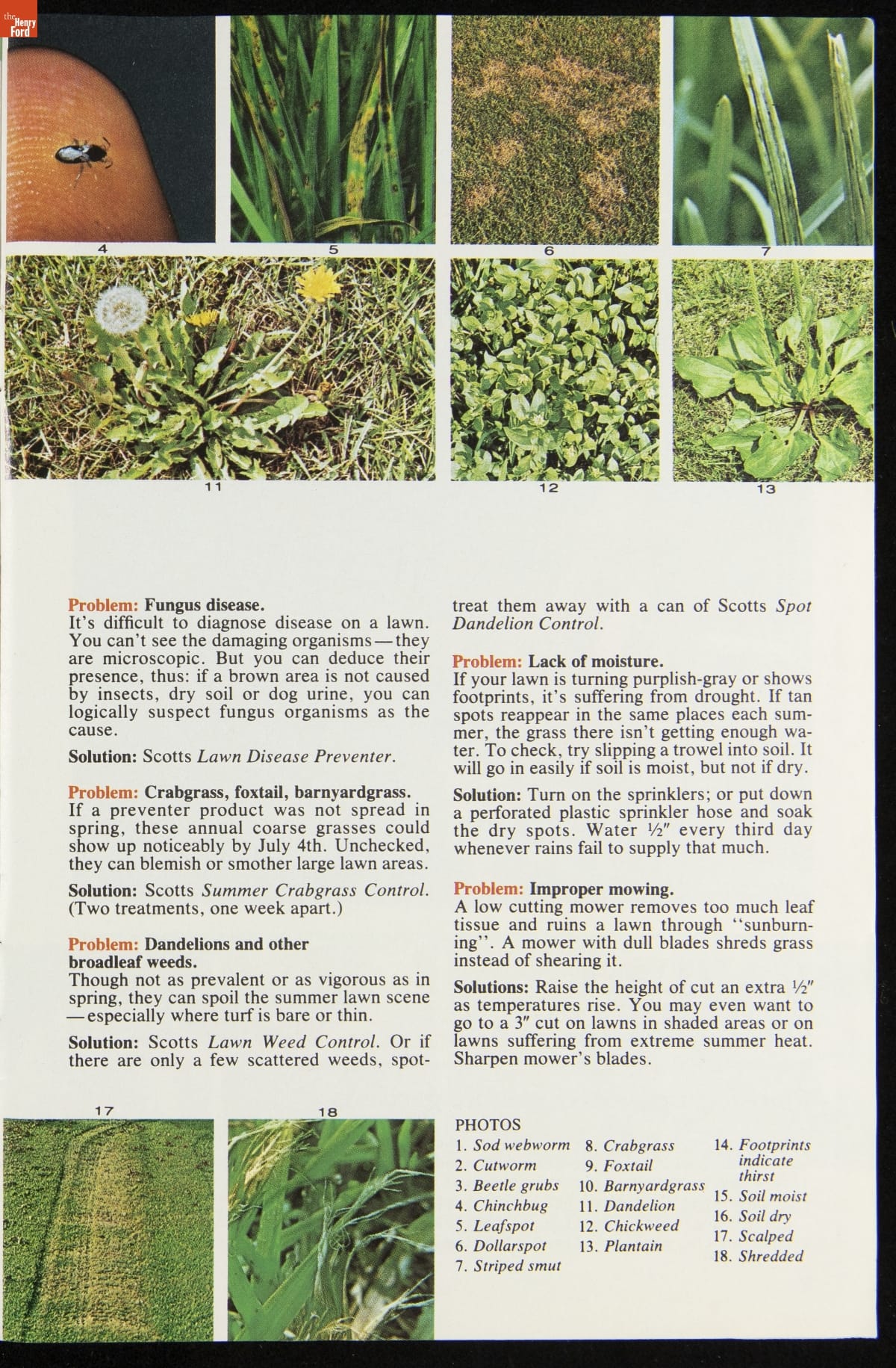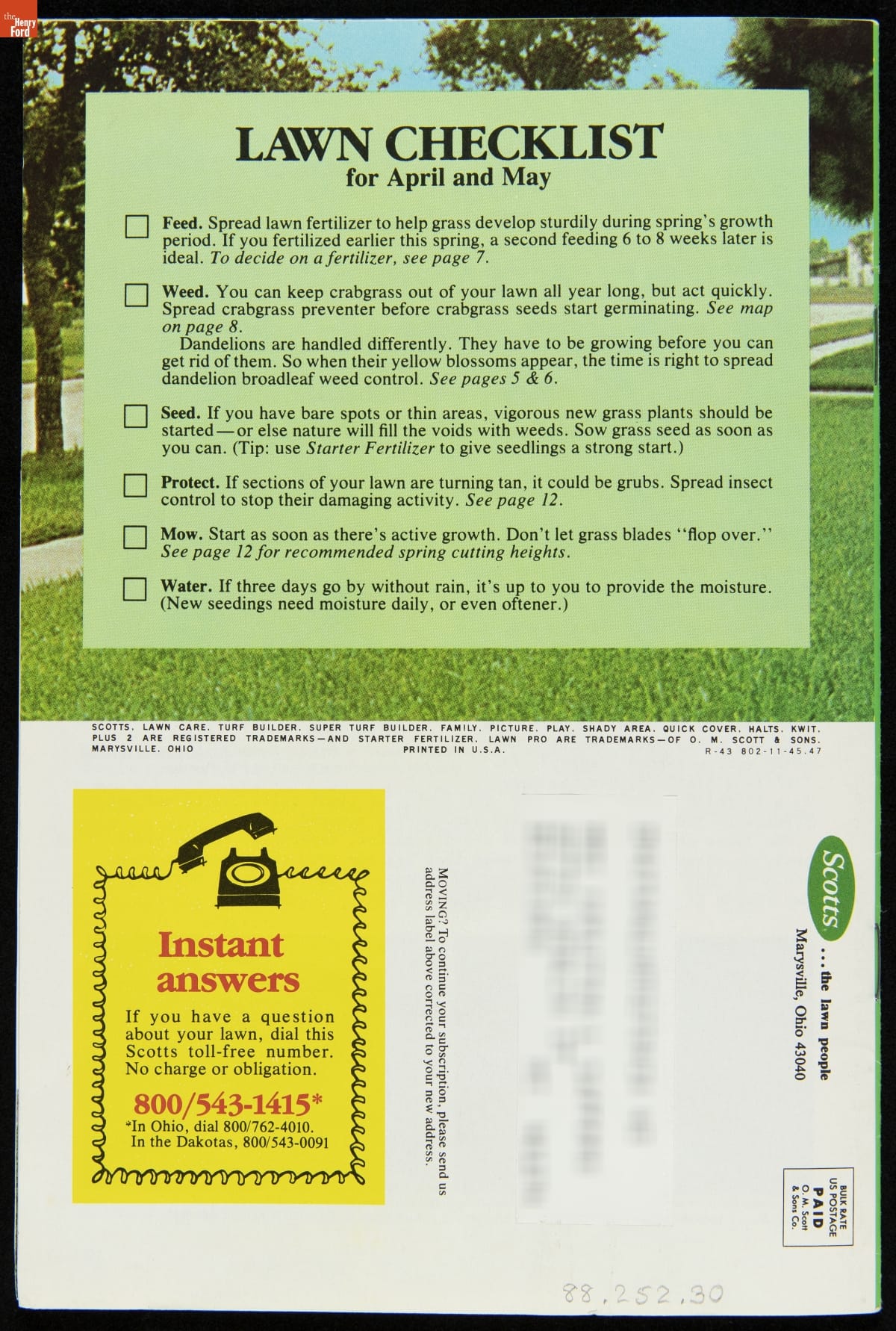 With the explosive growth of suburban neighborhoods during the 1920s, the quest to maintain a "perfect" weed-free lawn opened a lucrative market for lawn care products. O.M. Scott & Sons Co., a major fertilizer and herbicide manufacturer better known as Scotts, launched its promotional magazine, "Lawn Care," in 1928. This 1980 edition included consumer tips and recommended Scotts products.