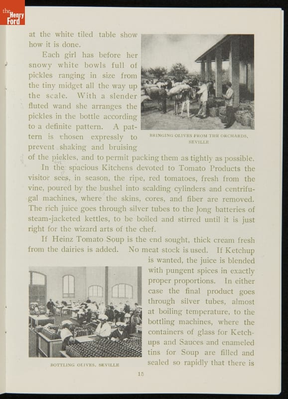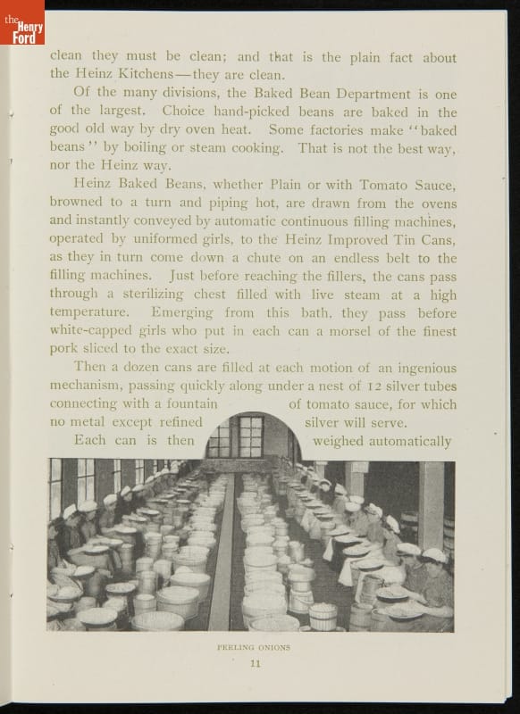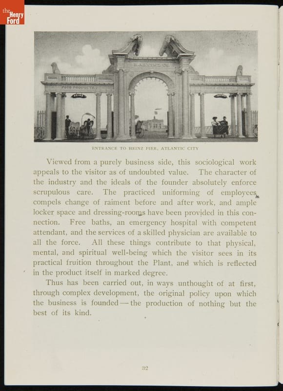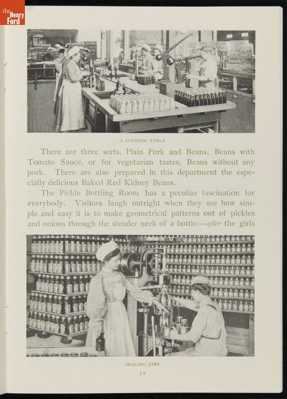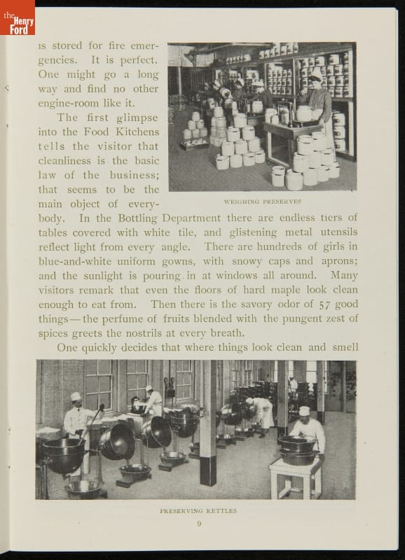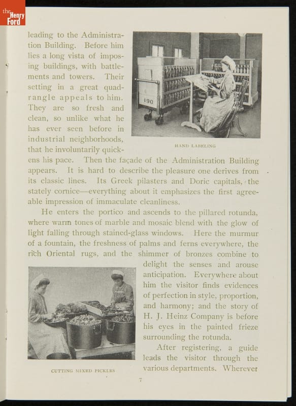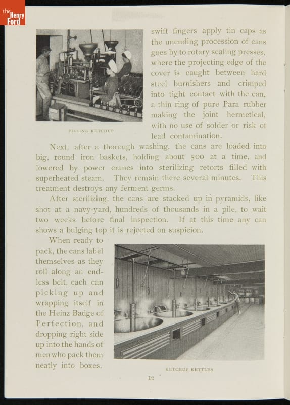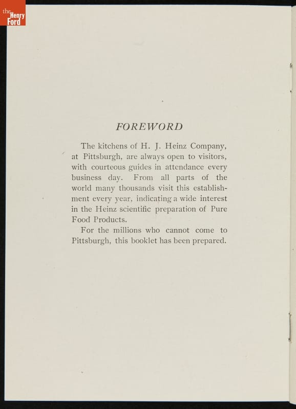 The H.J. Heinz Company was one of the first in the manufactured food industry to open its factory for public tours. This pamphlet from 1910 is essentially a written version of the tour, meant for those who were unable to experience it first-hand. The pamphlet provides a brief company history and includes photographs and descriptions of the kitchens, all manufacturing departments, and special employee areas.
