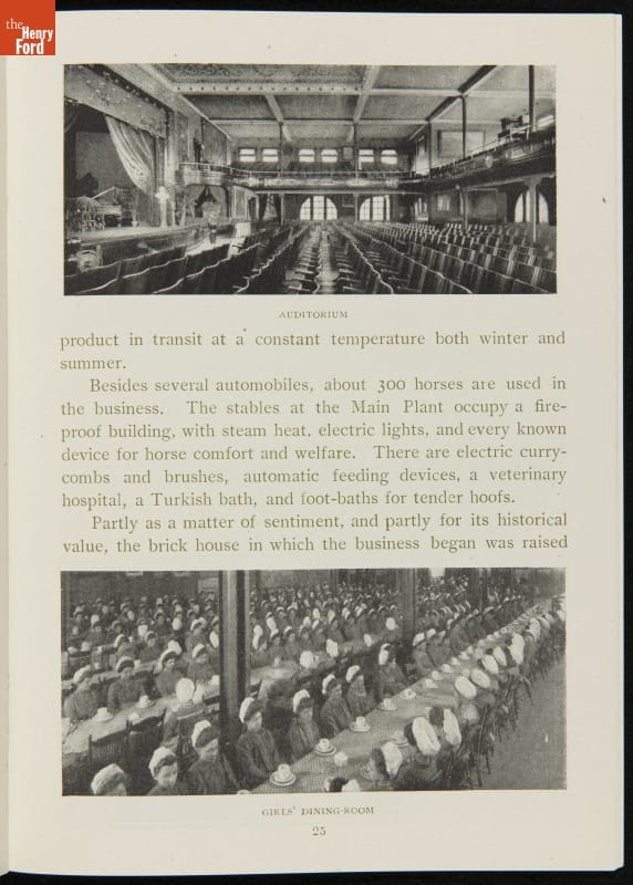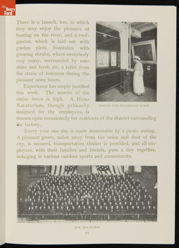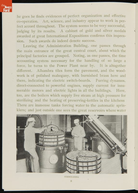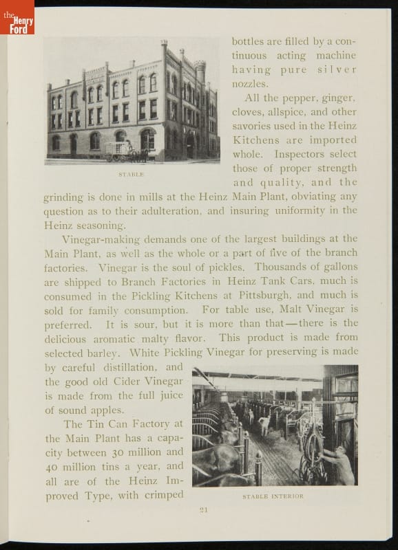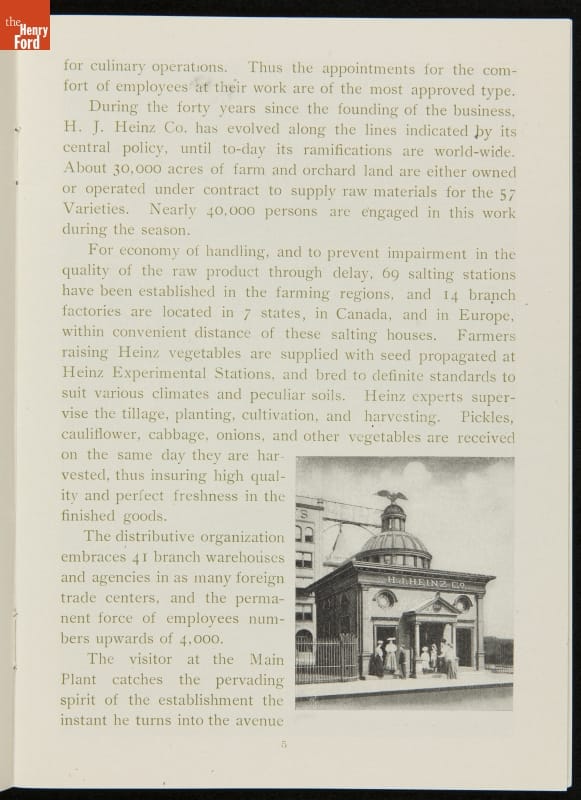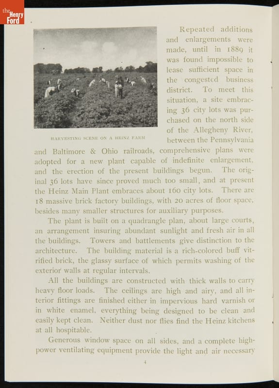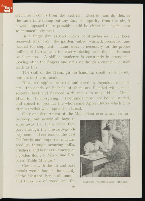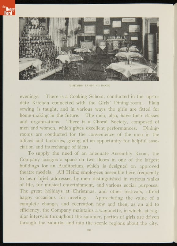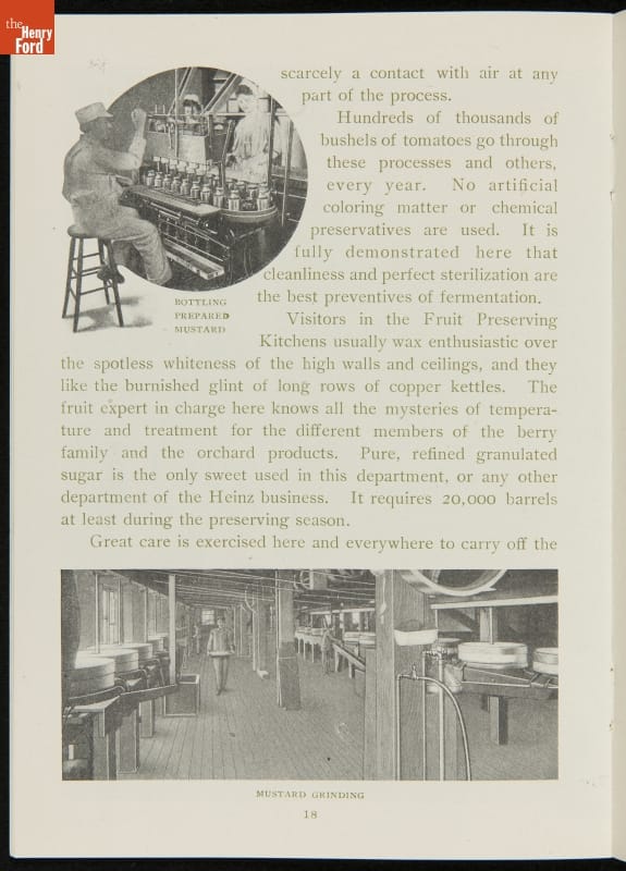 The H.J. Heinz Company was one of the first in the manufactured food industry to open its factory for public tours. This pamphlet from 1910 is essentially a written version of the tour, meant for those who were unable to experience it first-hand. The pamphlet provides a brief company history and includes photographs and descriptions of the kitchens, all manufacturing departments, and special employee areas.