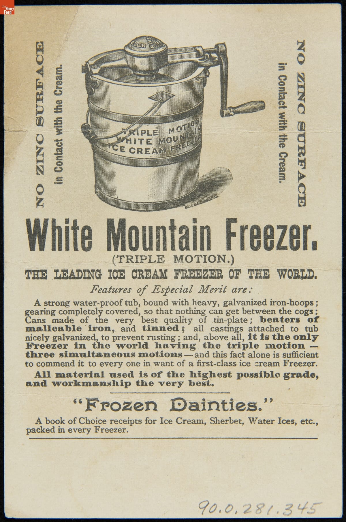 Trade Card for White Mountain Ice Cream Freezers, Wheeler & Wilson Mfg. Co., 1880-1900