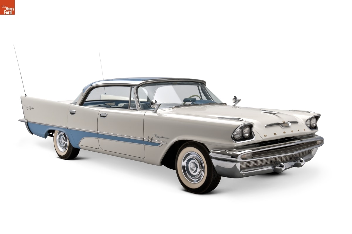 De Soto appealed to drivers who desired the cutting edge of technology. Soaring fins and an airy roof suggested military jet fighters. Pushbuttons replaced old-fashioned transmission levers. And De Sotos were powerful -- perfect for the new high-speed, four-lane turnpikes and the newly funded interstate highway system.
