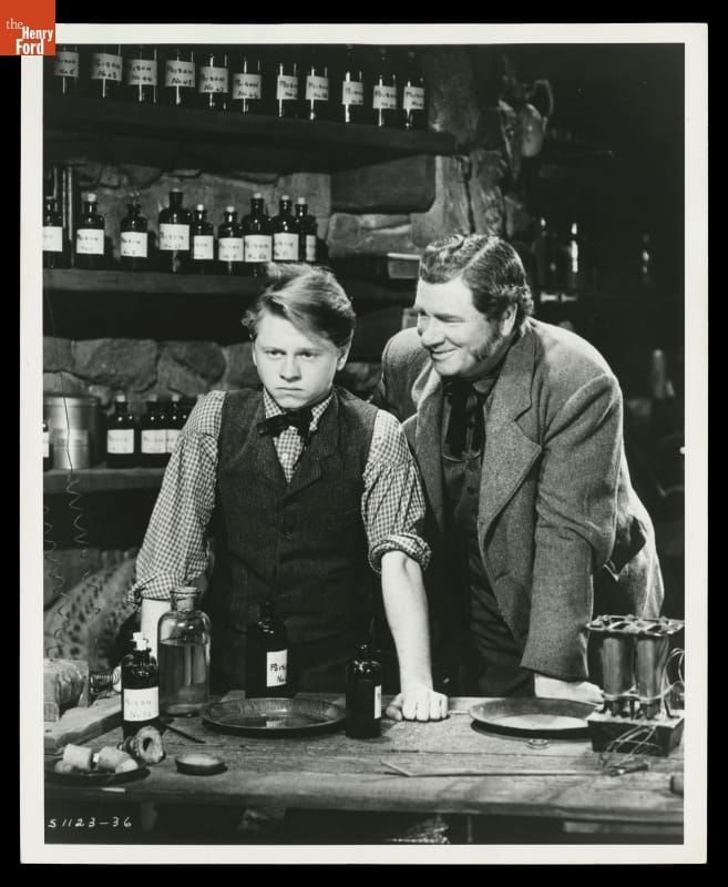 The 1940 film Young Tom Edison explores the early life of the inventor. Mickey Rooney (left) stars as the teenage Thomas Edison, and George Bancroft (right) portrays Edison's father. The film recounts Edison's early experiments and attempts at invention--the disasters and triumphs. The film premiered in Port Huron, Michigan, where young Tom grew up.