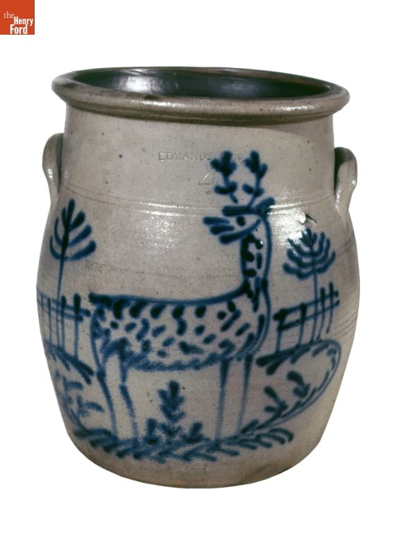 This jar was made of a durable, leak-proof pottery called stoneware, shaped on a potter's wheel. The orange-peel-like outer glaze was created when the potter threw handfuls of common rock salt into a white-hot kiln during the piece's firing. Salt-glazed stoneware pieces were decorated with an amazing array of designs, including the stag and landscape on this piece.