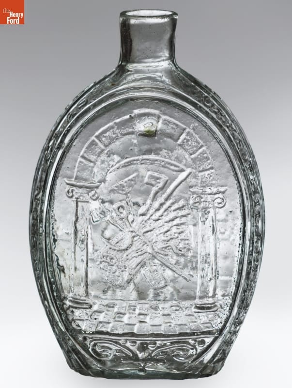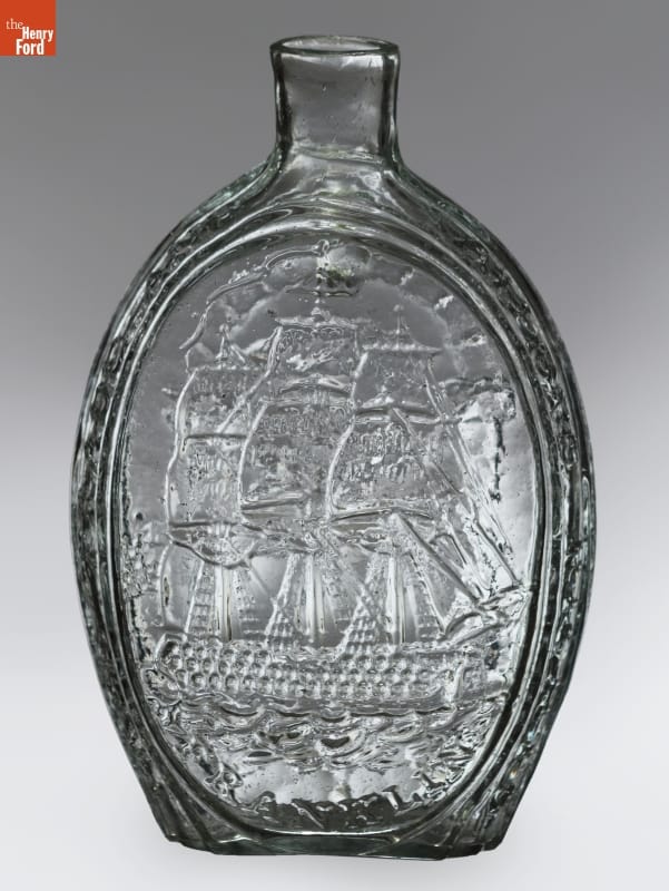 Glass factories in America began producing inexpensive, mold-formed flasks in the early 1800s. These figured flasks, often decorated with phrases and symbols of national pride, appealed to the common man. The U. S. frigate Franklin and the War of 1812 slogan "Free Trade and Sailor's Rights" adorn this 1820s flask. Americans continued to use this patriotic slogan throughout the 19th century.