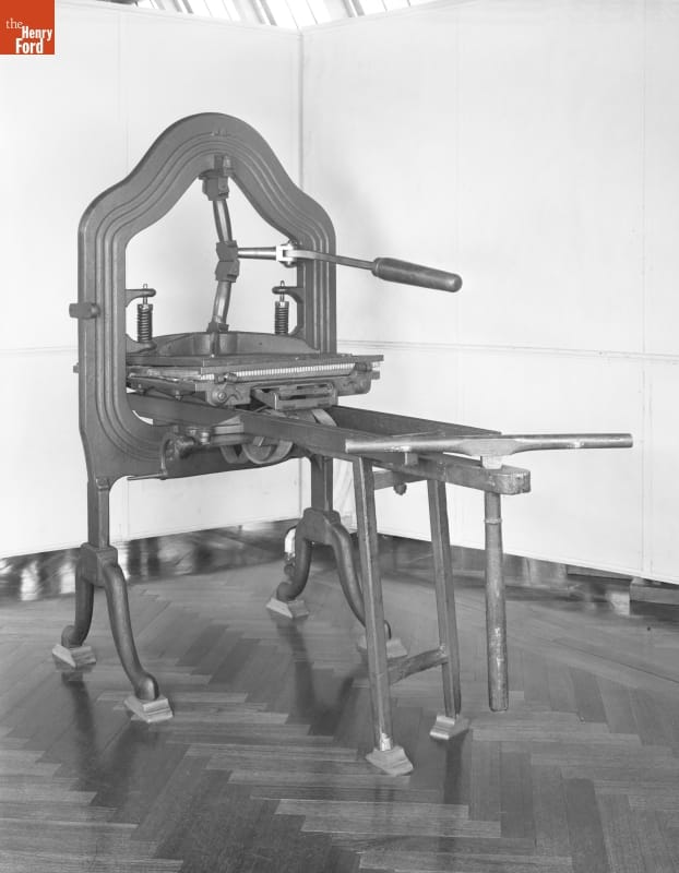 The Wells press was one of the most popular toggle-joint hand-printing presses of the early 19th century. Its iron frame and lever system improved upon the common wooden frame and screw press, doubling the speed of printing. In 1870, this particular press printed the first newspaper in Monroeville, Ohio, and in 1876, performed the same task in Attica, Ohio.