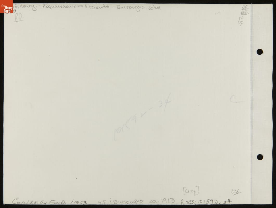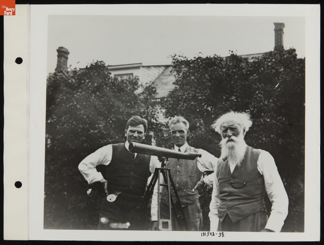 Henry Ford read and admired the works of John Burroughs. In the early 1910s, Ford sought out the internationally known naturalist and writer and the two became friends. Ford and Burroughs bonded over their love of birds and nature. They often visited each another and traveled together with mutual friends. This photo shows the pair with Glen Buck, editor of the Ford Times.