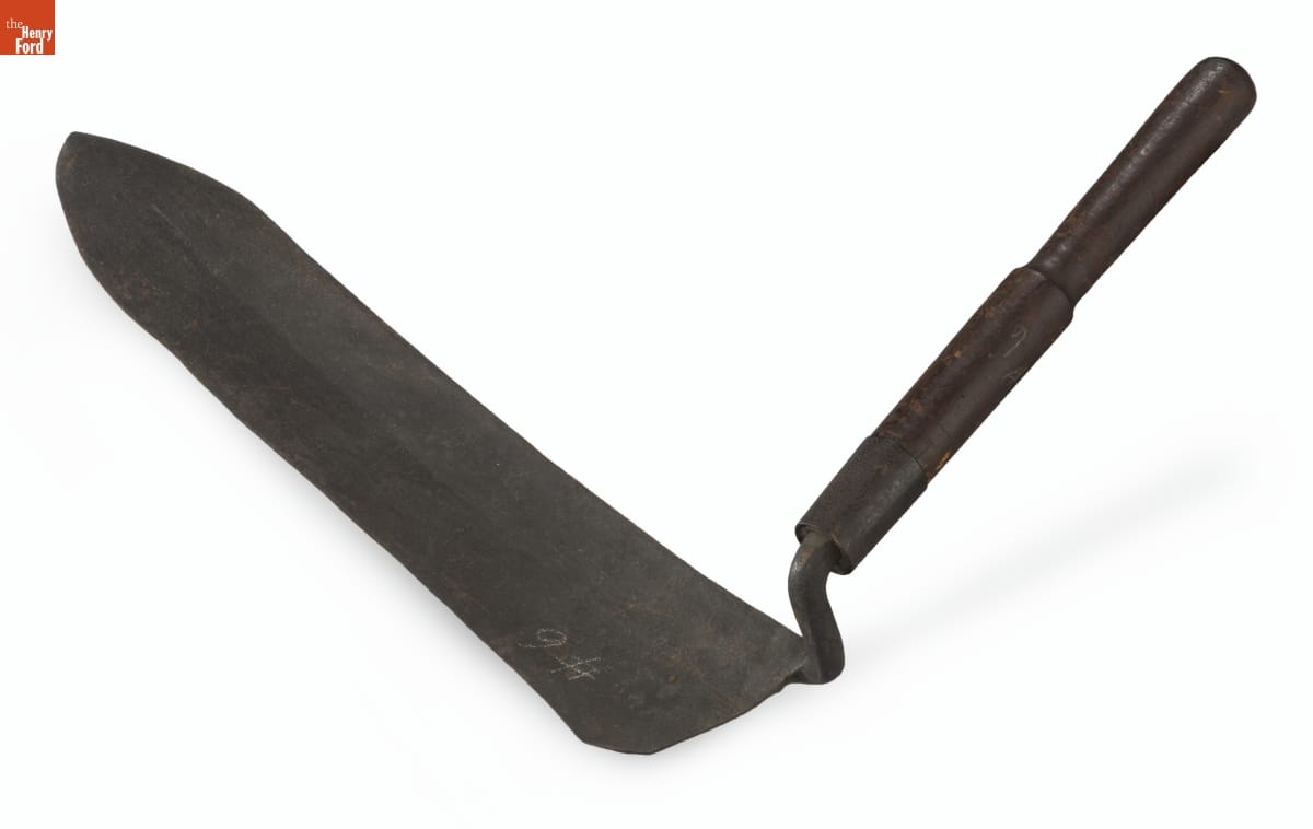 Farm families cut and cured enough grass each summer to feed hay to their livestock all winter. Stored hay settled over time and farmers used special knives made by blacksmiths to cut out chunks for feed. The smiths forged wrought-iron blades with a long cutting edge. The wooden handle was set on a tang (a pointed metal extension of the handle) and secured with a metal collar for durability.