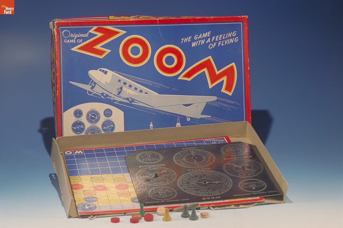 Players "fly" from coast to coast, stopping at cities along the way, in E.E. Fairchild's Original Game of Zoom. Four spinners (Dispatcher, Altitude, Weather, and Radio) dictate how a player moves. Fairchild produced the game at a time when regularly scheduled airline passenger service was becoming more common.