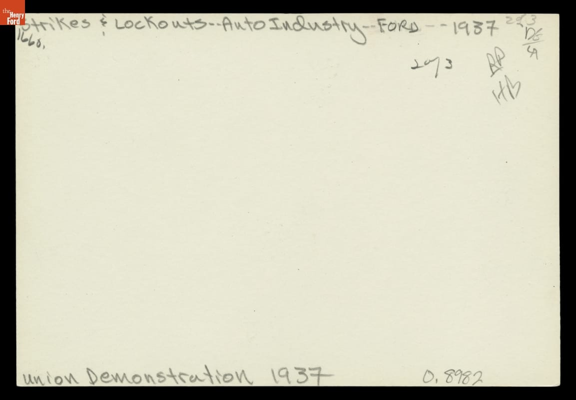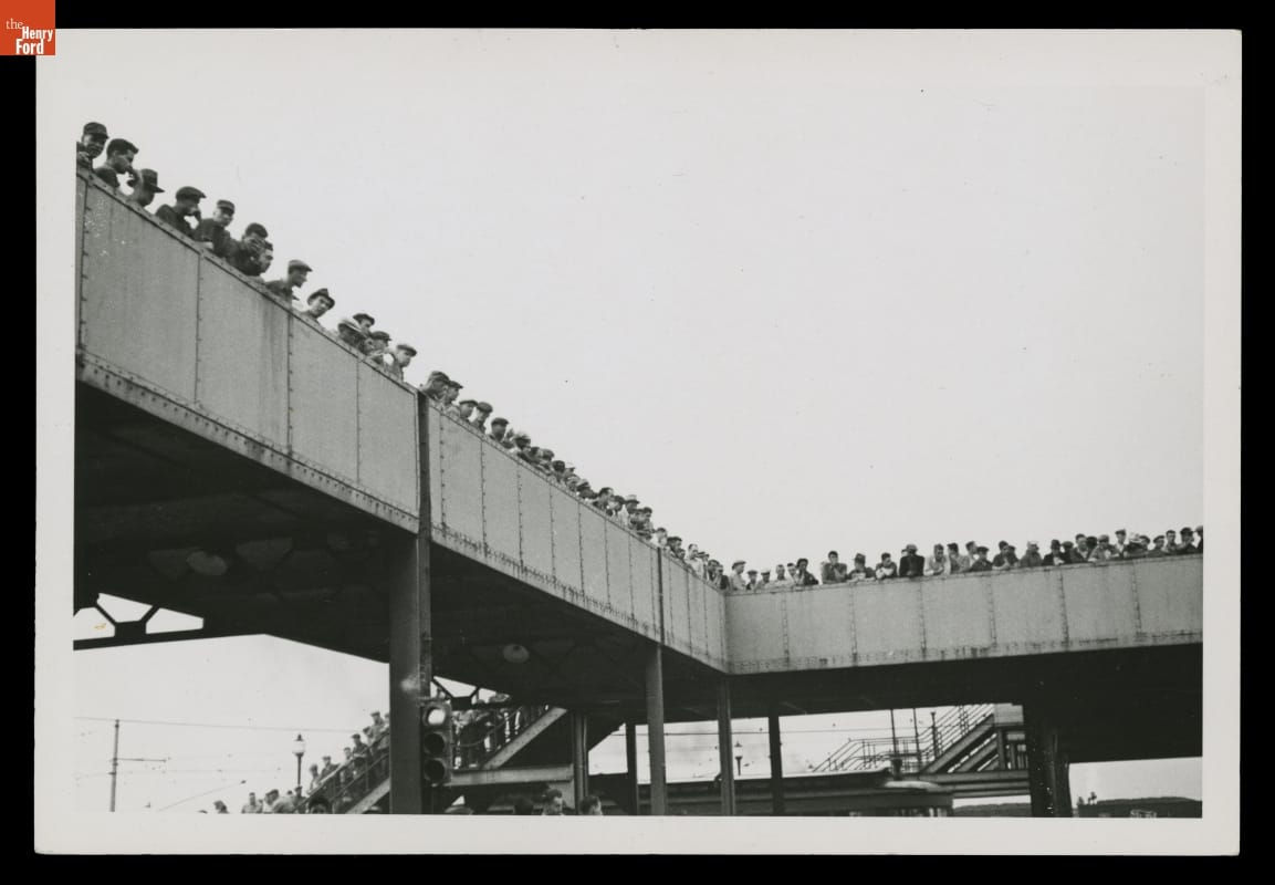 The struggle to unionize Ford Motor Company workers was long and--at times--violent. This photograph shows United Auto Workers (UAW) labor organizers demonstrating outside Ford's Rouge Plant pedestrian overpass during 1937. Four years later, following a turbulent ten-day strike in April 1941, Ford became the last major automotive manufacturer to recognize the UAW and agree to a union contract.