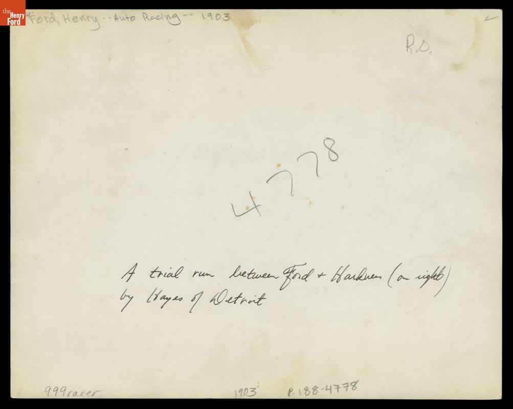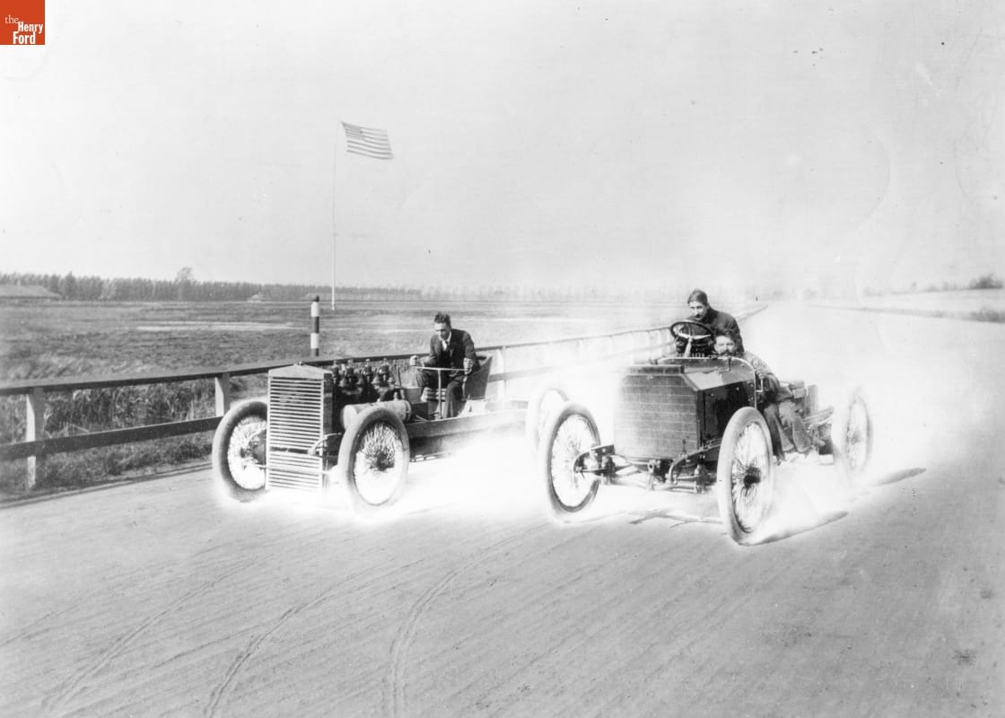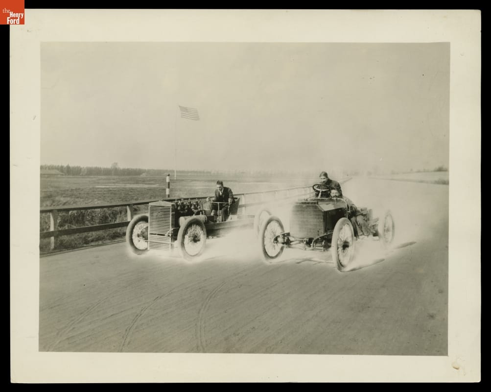Image originally published in the May 1903 issue of Munsey's Magazine captioned, "At full speed a trial brush between Messers [Henry] Ford (car to the left of the picture) and [Harry] Harkness." Less than a month before Ford Motor Company's founding, Henry Ford was still interested in automobile racing and the benefits to be gained in experimenting with parts of chassis, bodies, and engines that could be integrated into his future automobiles. Ford used trial races like this to test his experimental ideas.