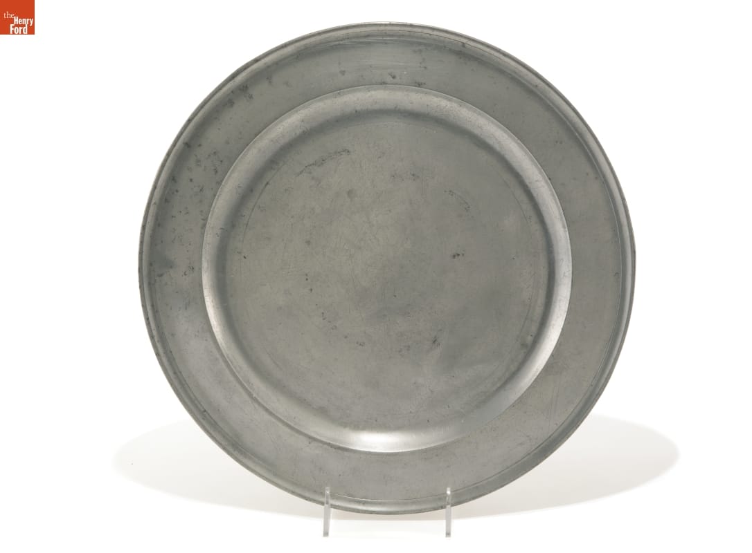 Pewter plates, like this one, could be found in middle income American homes in the late 18th and early 19th century. The tin alloy plate could be polished and brightened to simulate silver--something many in the middle class aspired to own. Proud owners would display the plates when they were not being used.