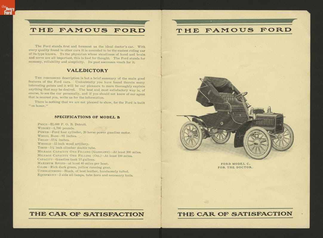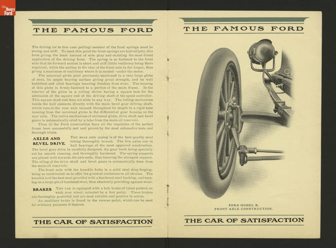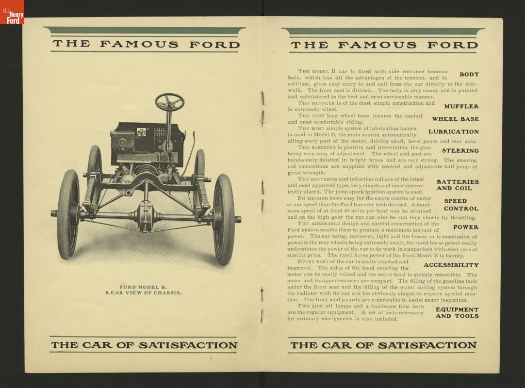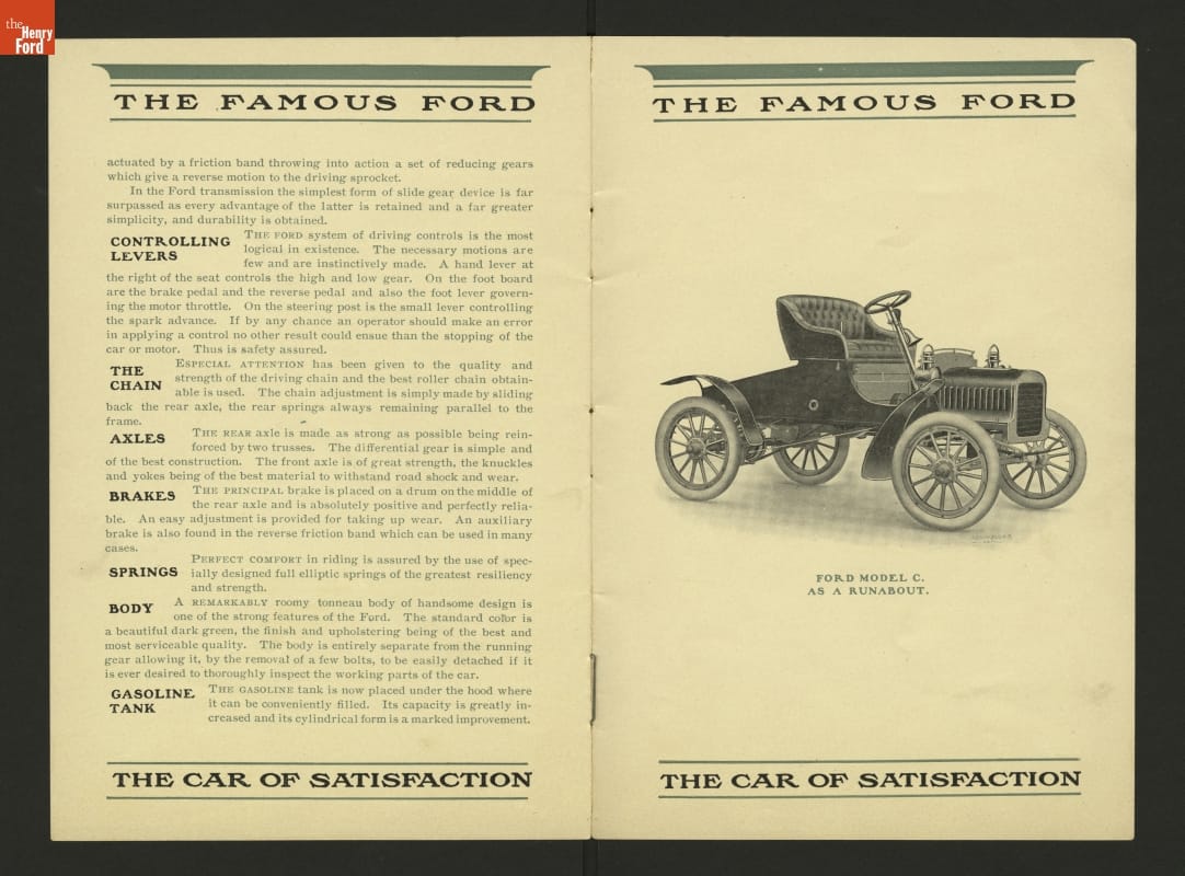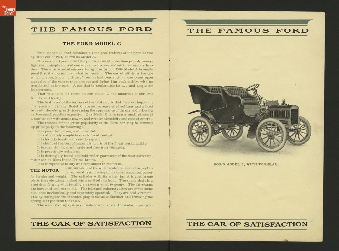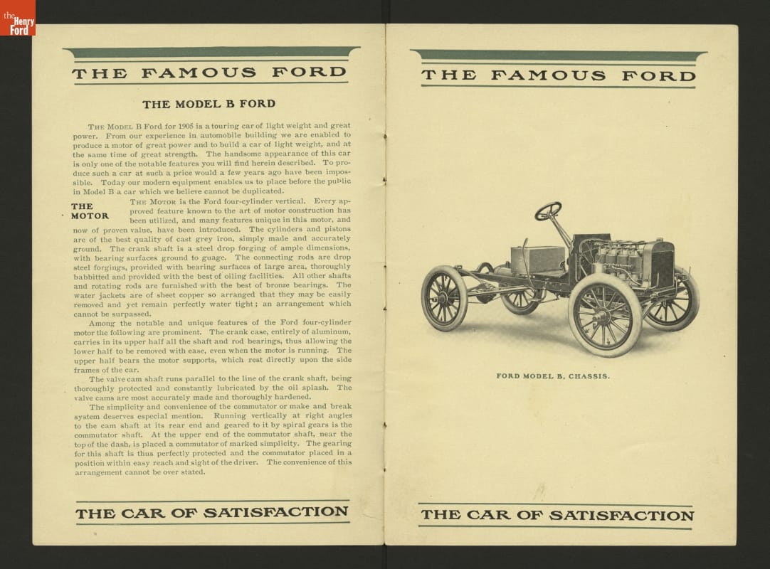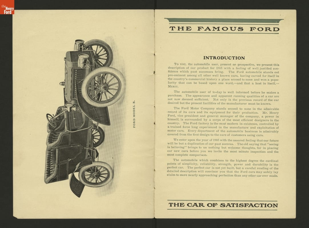 This 1905 Ford Motor Company sales brochure, like previous sales literature, continued to call Henry Ford's automobiles "The Car of Satisfaction." Ford set out to create a lightweight and inexpensive vehicle. Not satisfied with these early attempts, Ford continued to improve and innovate. In 1908, Ford created the vehicle he envisioned: the Model T.