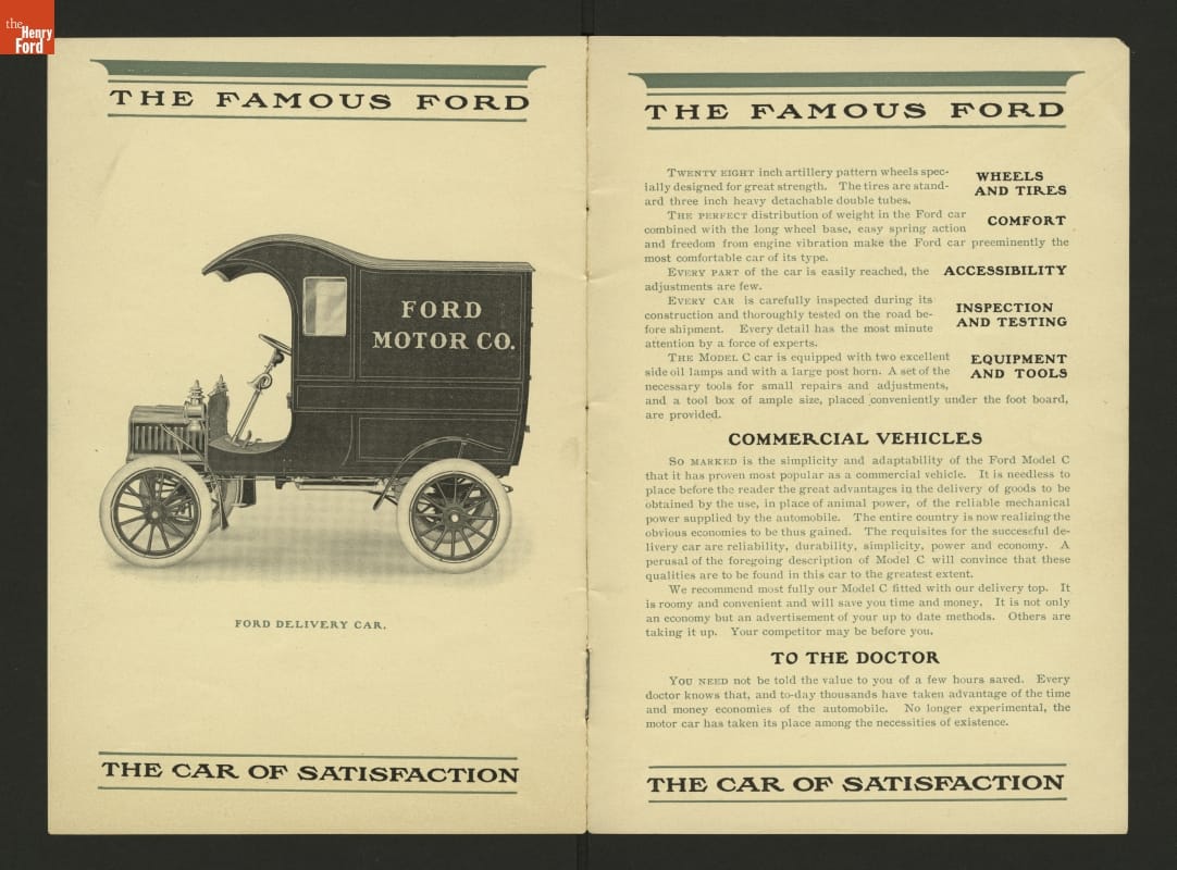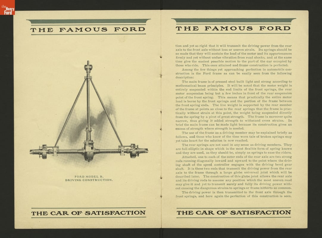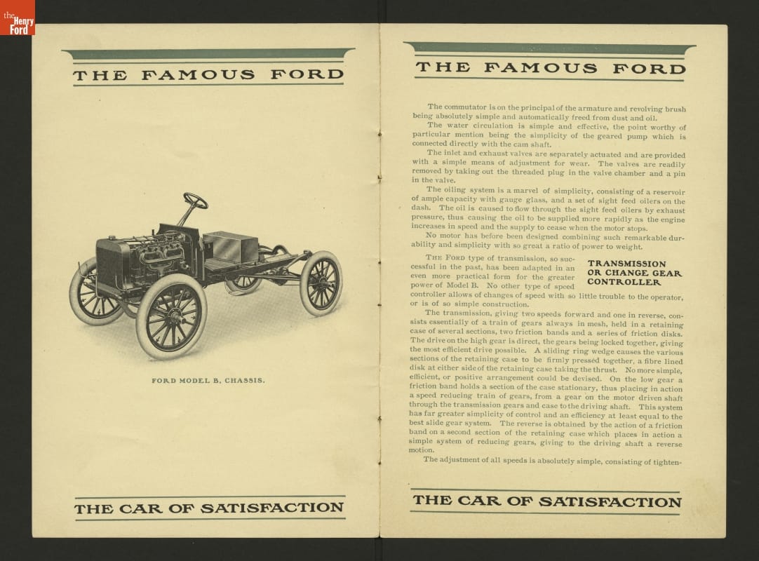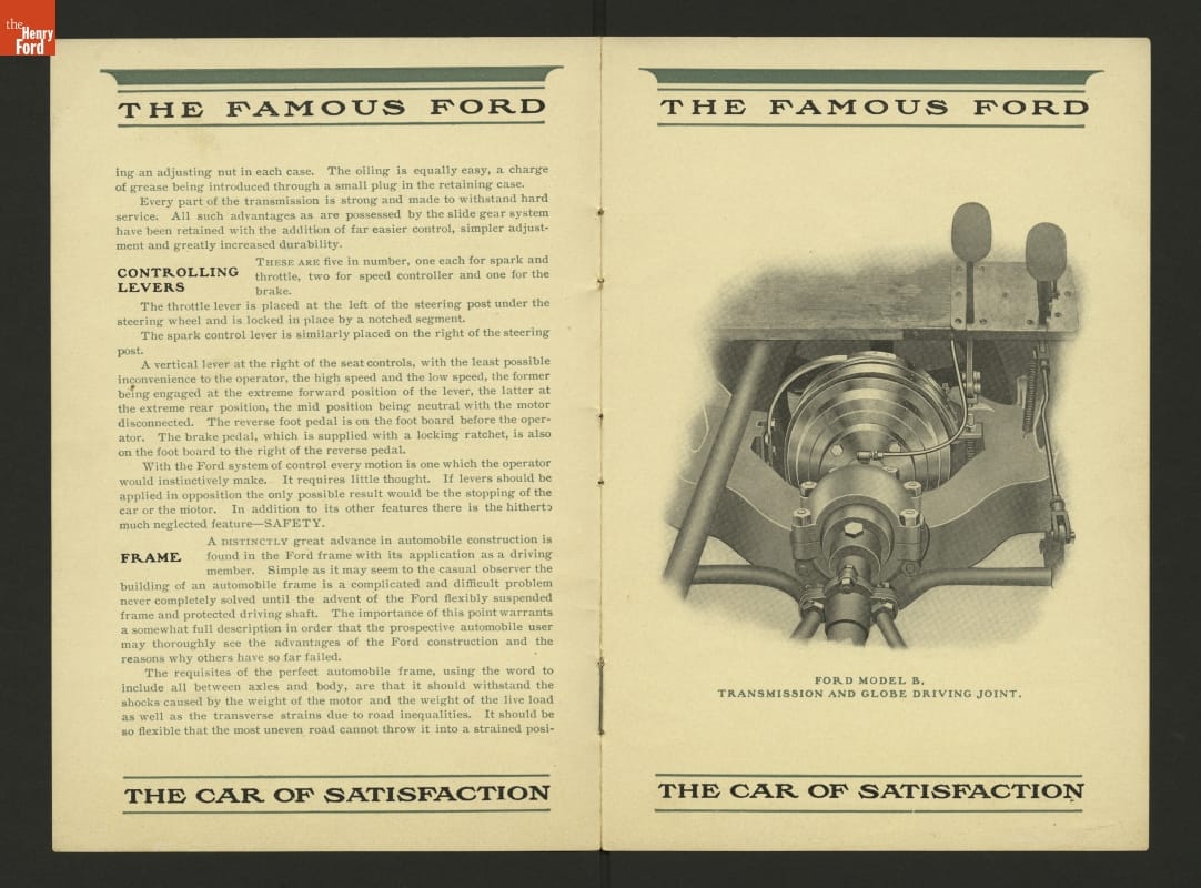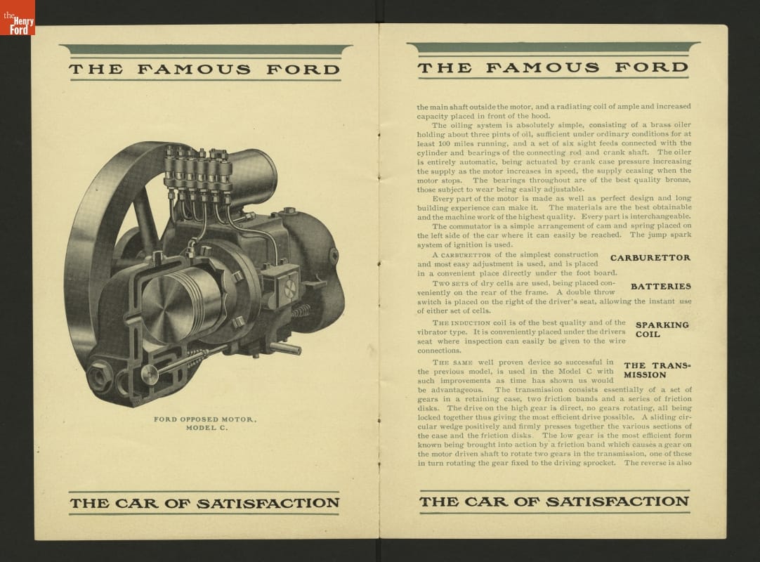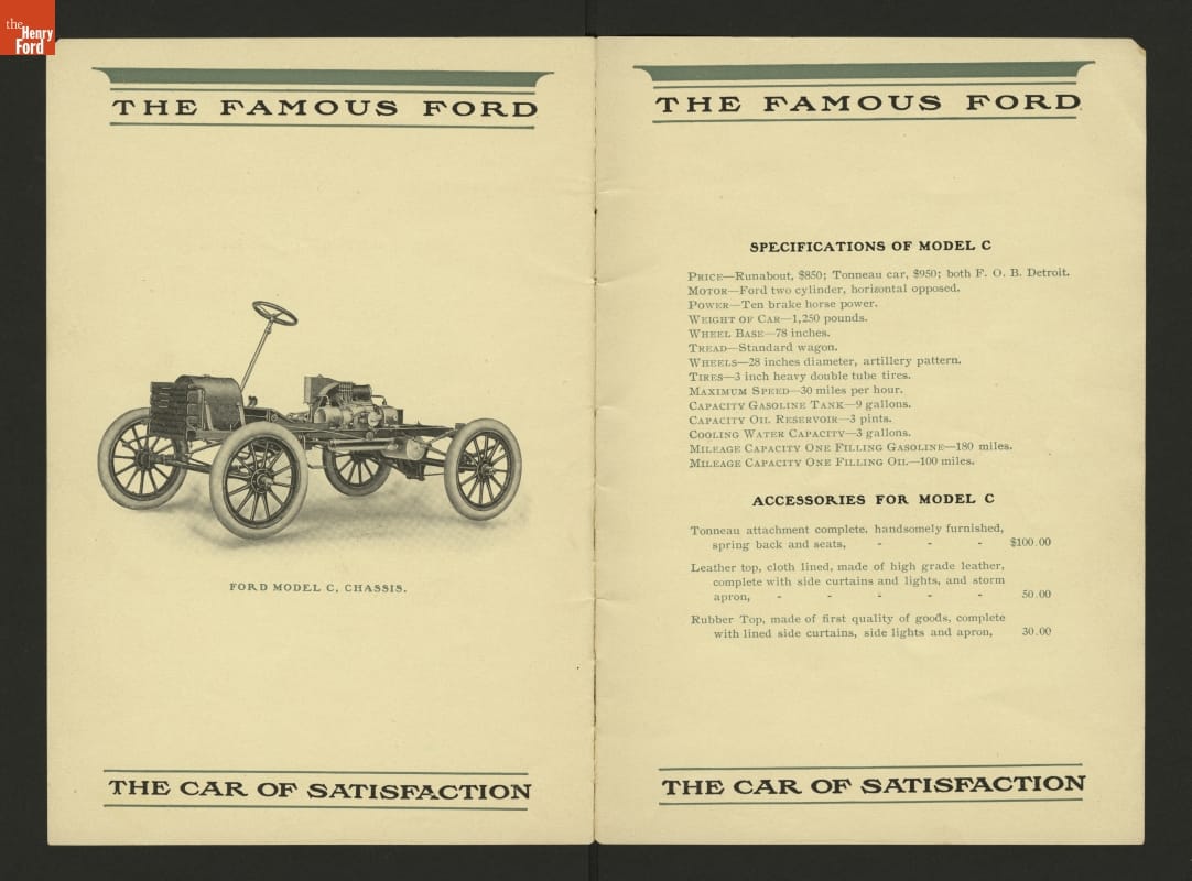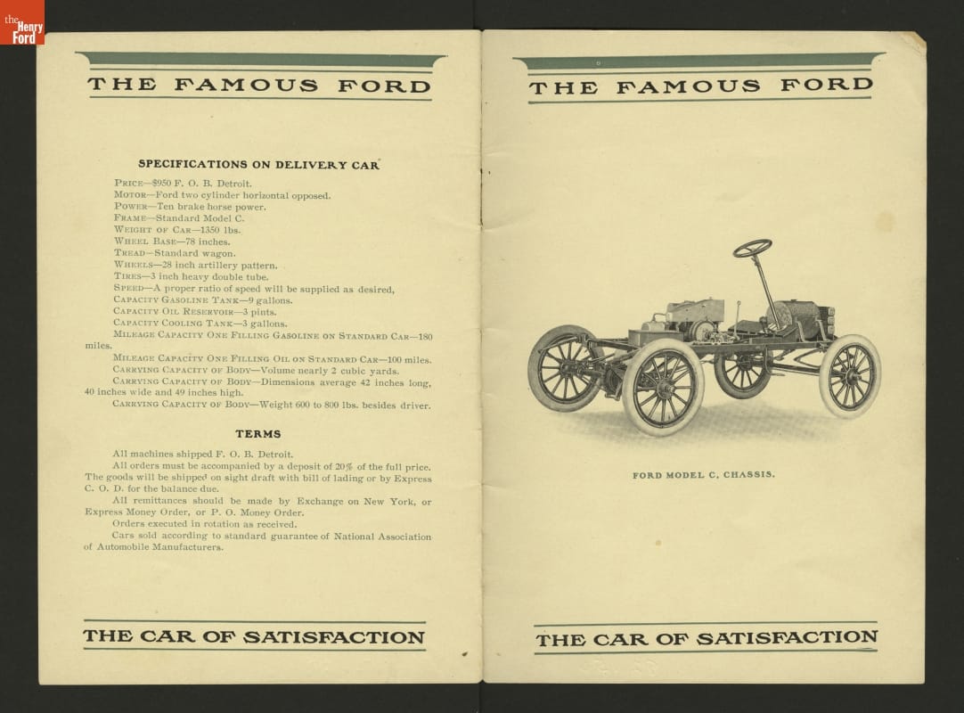 This 1905 Ford Motor Company sales brochure, like previous sales literature, continued to call Henry Ford's automobiles "The Car of Satisfaction." Ford set out to create a lightweight and inexpensive vehicle. Not satisfied with these early attempts, Ford continued to improve and innovate. In 1908, Ford created the vehicle he envisioned: the Model T.