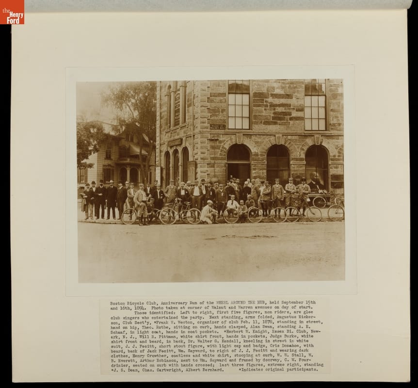 Local Boston bicycle clubs organized annual tours called Wheel Around the Hub. The one pictured here took place in 1894. The original tour, held in 1879, traveled one hundred miles around Boston, Massachusetts, with cyclists pedaling high-wheel bicycles. Fifteen years later, club members were riding Rover-style "safety" bikes as seen in this photograph.