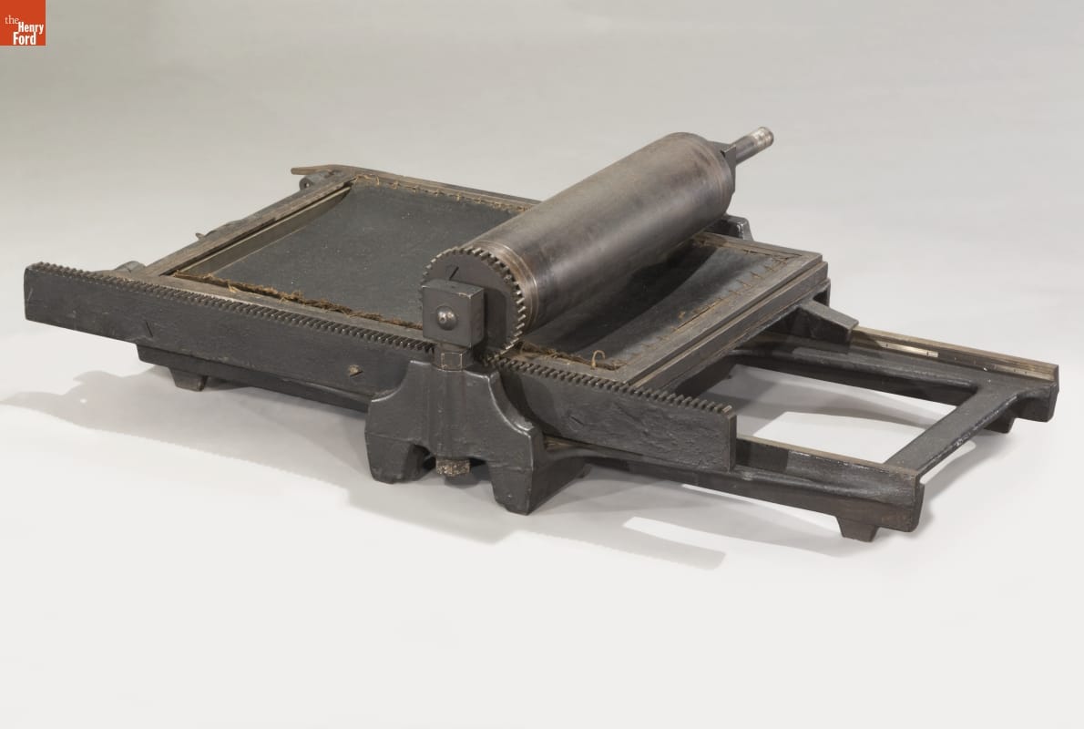Press mechanism invented by Henry Barth, press manufactured by the Cincinnati Type Foundry of Cincinnati, Ohio.