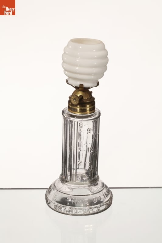 Time lamps are much like today's night lights; mainly used in bedrooms. Hour numerals are pressed into the glass reservoir. As the kerosene burned overnight, the diminishing fuel was supposed to indicate the time. Though a clever novelty, they proved unreliable, as the level of consumption was inconsistent.
