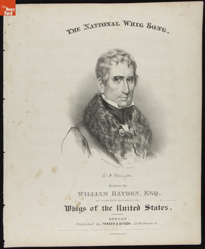B.W. Thayer's Lithogy. Boston. / W.H. Harrison / Written by WILLIAM HAYDEN, ESQ. and respectfully dedicated to the Whigs of the United States. / Price 25 cts. nett. / BOSTON. Published by PARKER & DITSON, 135 Washington St. / Entered according to Act of Congress in the year 1840 by Parker & Ditson in the Clerk's office of the District Court of Massachusetts.