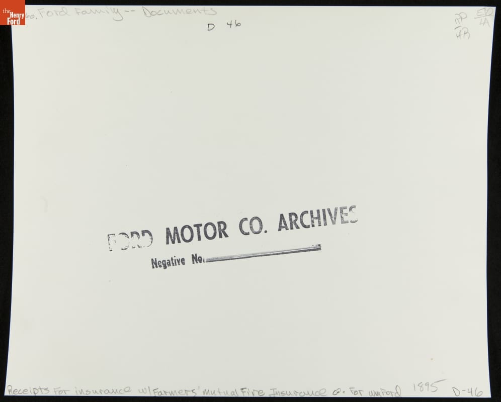 When William Ford, Henry Ford's father, emigrated from Ireland in 1847 at the age of twenty he had little wealth. William settled near family in southeast Michigan and eventually purchased a tract of land. By the late 19th century, William was a prosperous farmer and secure enough to protect his property with insurance.