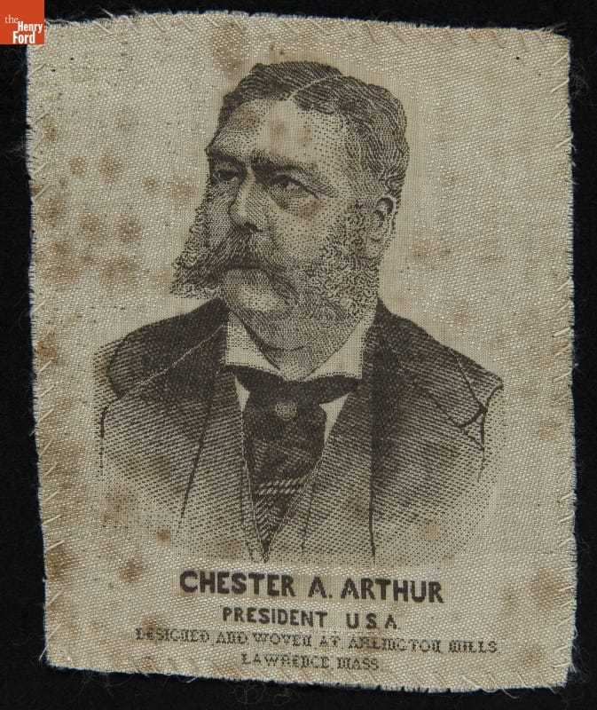 Front: CHESTER A. ARTHUR / PRESIDENT U S A / DESIGNED AND WOVEN AT ARLINGTON MILLS / LAWRENCE, MASS
