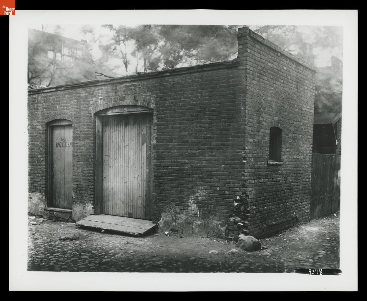 Henry Ford reconstructed the Bagley Avenue Workshop, the shed behind the duplex house at 58 Bagley where he and Clara had lived, in Greenfield Village in 1933. Ford built the 1896 Quadricycle, his first automobile, in the original shed. Photos of the original building and site guided the reconstruction. Bricks from the actual Bagley house reportedly were used in the replica shed.