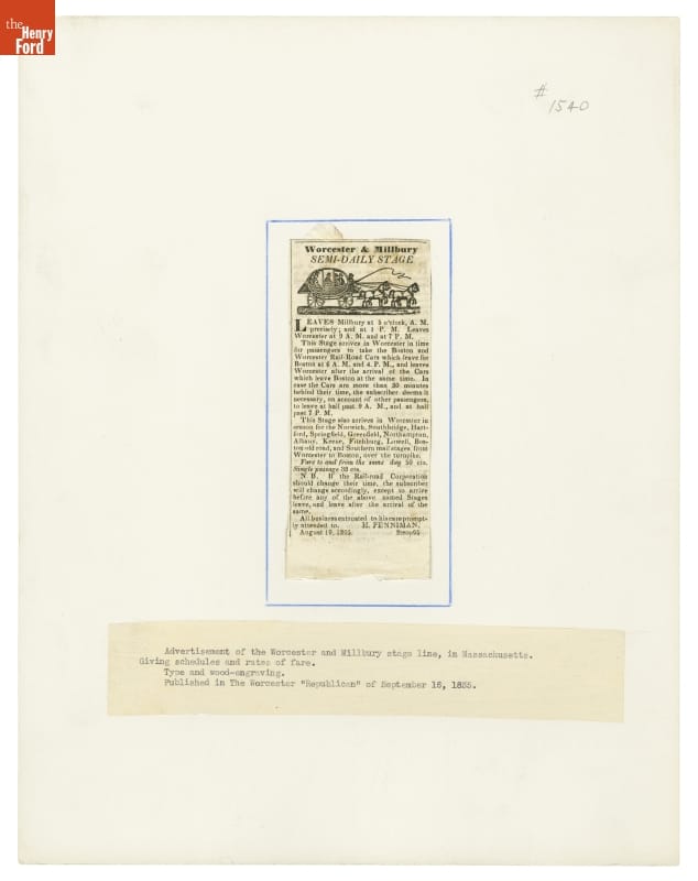 Stagecoach lines in the mid-1800s helped link outlying communities to cities and towns with railroad stops. The Worcester & Millbury Stage Line provided inhabitants of Millbury, Massachusetts, with regular access to the Boston and Worcester Railroad. Passengers could also use this service to connect with different stage lines that ran between other New England towns.