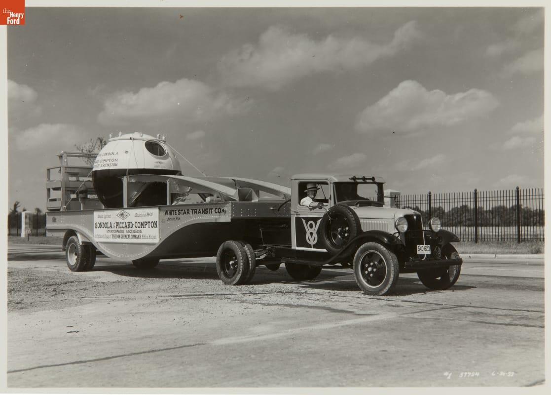 The Piccard-Compton Stratosphere Balloon launched in August 1933 at the Chicago World's Fair, piloted by Lt. Commander "Tex" Settle. The magnesium gondola and hydrogen balloon quickly crashed soon after launch due to an open valve. It is shown here in June, hauled by a Ford V-8 truck. Jean and Jeannette Piccard successfully relaunched it in October 1934 from Ford Airport.