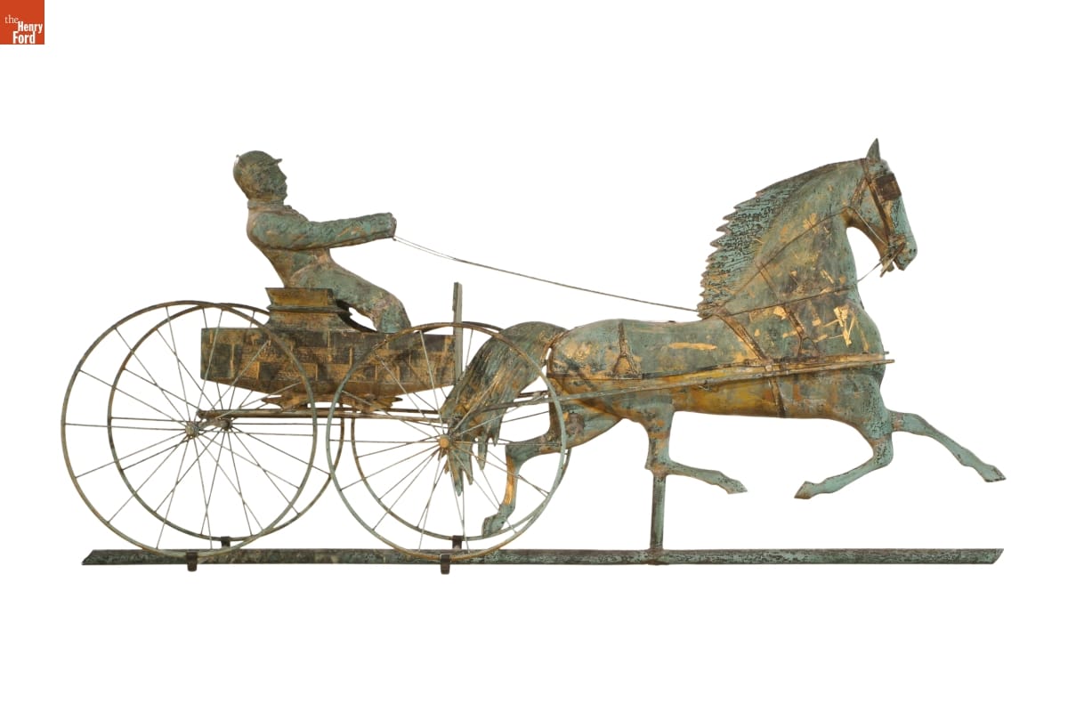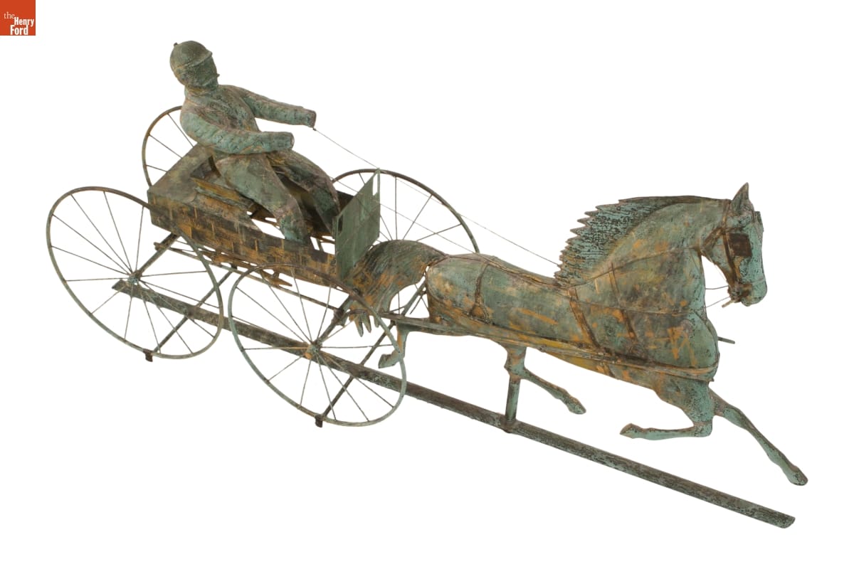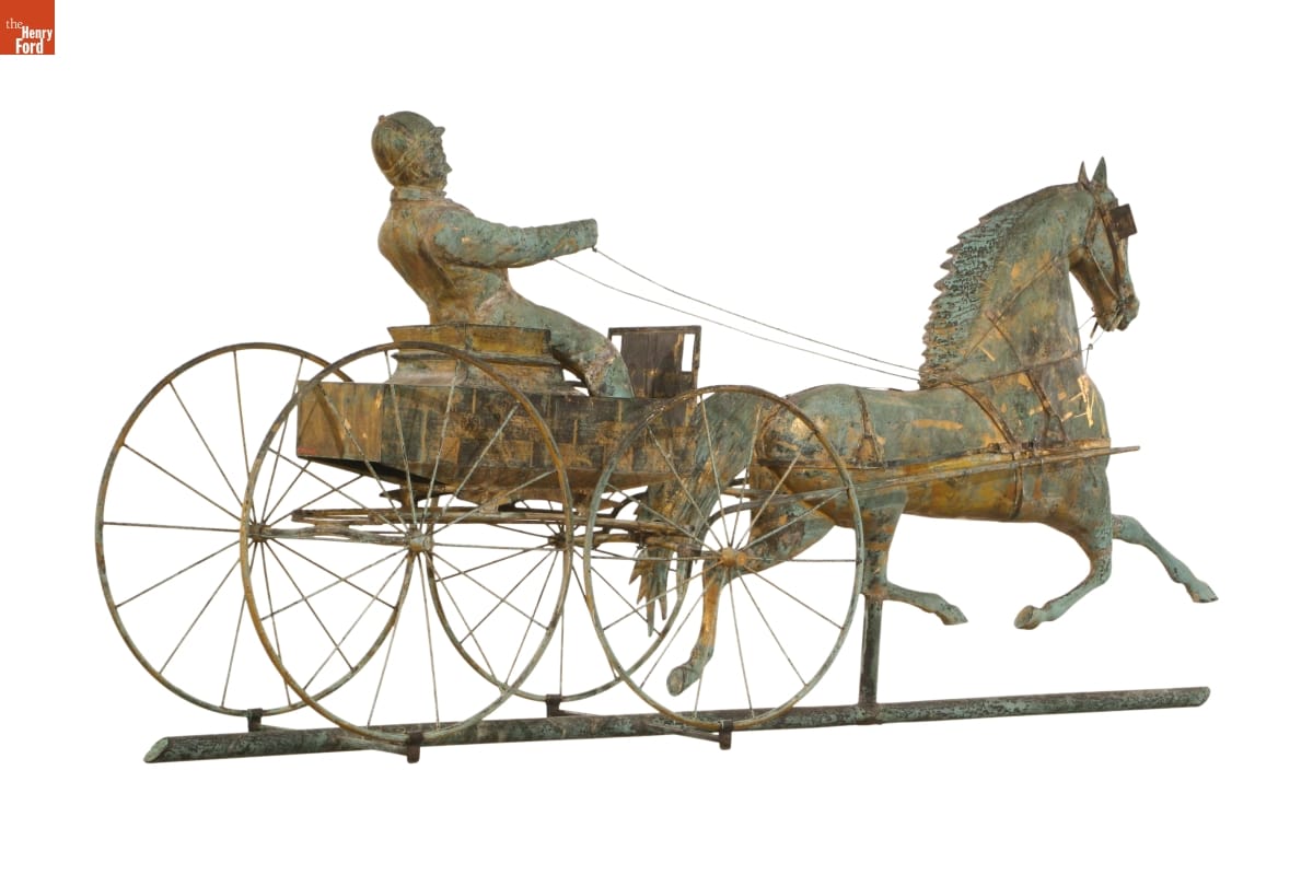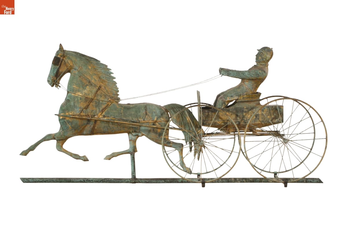 Weathervanes point into the direction of the wind. This helped viewers anticipate weather changes before local forecasts became common after 1920. Functional weathervanes required a basic pointing device and directional arms, but manufacturers added decorative elements, or ornaments, to appeal to consumer interests. They most often depicted horses. This one featured a swift horse pulling a runabout.