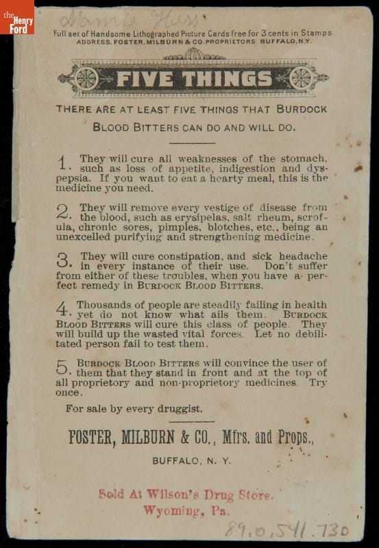 Advertised products made by Foster, Milburn & Co., Buffalo, New York. Retailed by Wilson's Drug Store, Wyoming, Pennsylvania. Card lithographed by Cosack & Co., Buffalo, New York