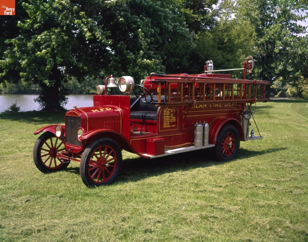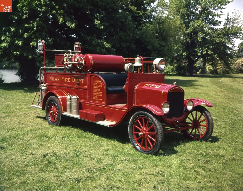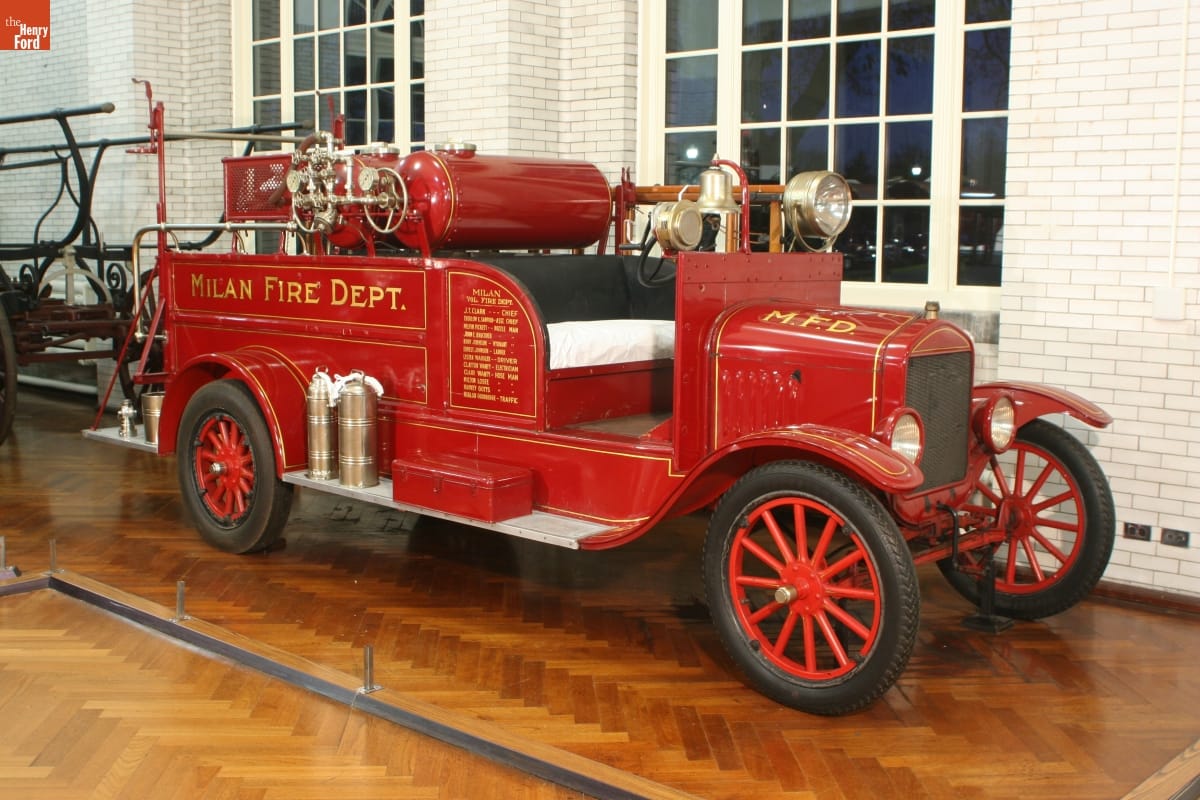 The versatile Model T could be modified for firefighting. Affordable T-based fire trucks were popular for small towns with modest budgets. This 1926 truck, adapted by American LaFrance, served Milan, Michigan, for 12 years. Henry Ford saw the truck in Milan, requested it for his museum, and gave the community a new 1938 truck in trade for it.