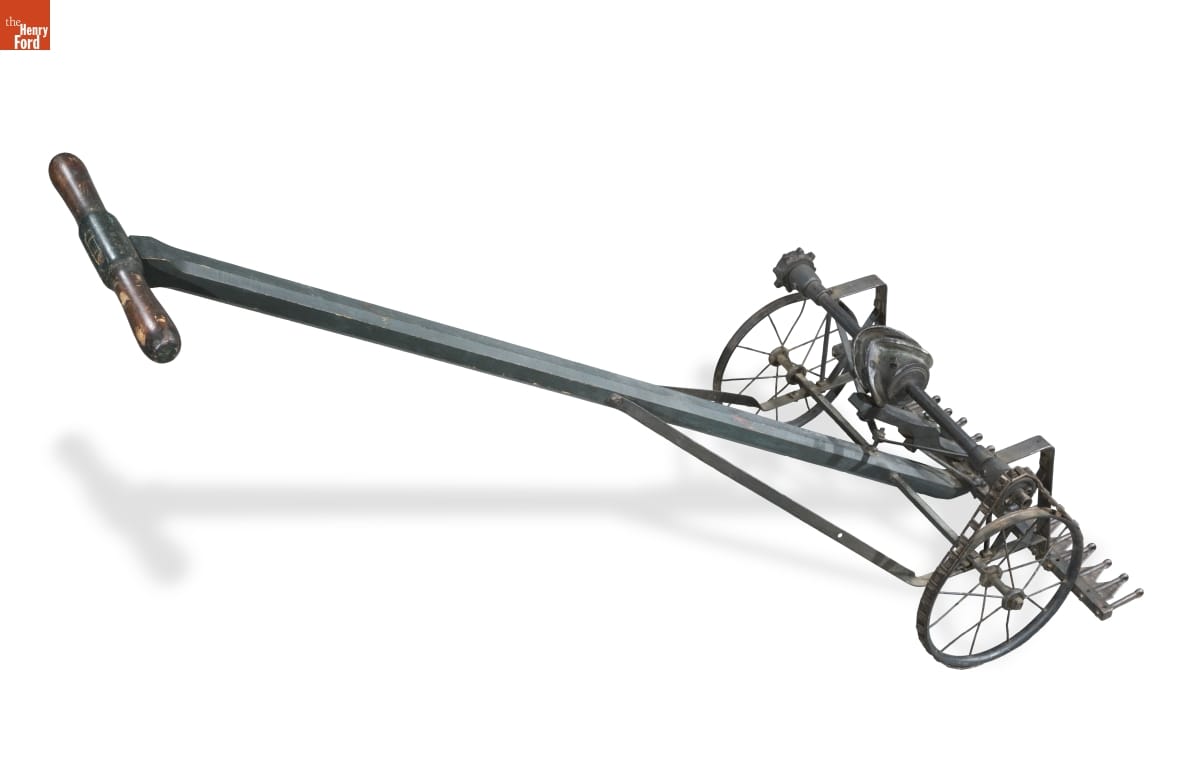 In the years following the American Civil War, improved transit allowed suburbs to grow around cities. Well-kept lawns were a key feature of a suburban home, and the lawn mower was an essential tool. A chain drive powered the sideways cutting action of this early push mower.