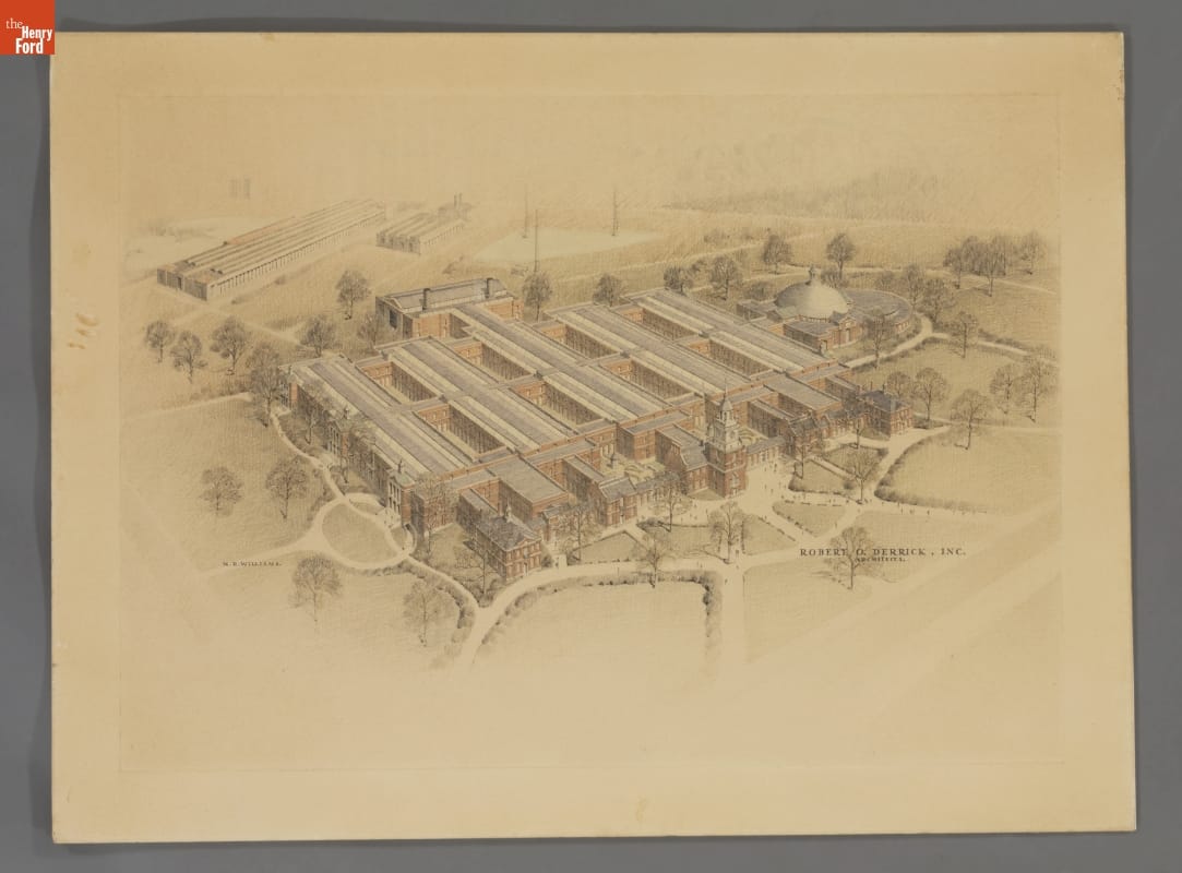 This is one of three color perspective renderings of the proposed Museum building presented to Henry Ford by architect Robert O. Derrick. This bird's eye view shows a two-story structure, with courtyards providing light and air into the galleries. Henry Ford rejected this proposal preferring the exhibits on a single floor. The focal point was a full-scale replica of Independence Hall in Philadelphia.