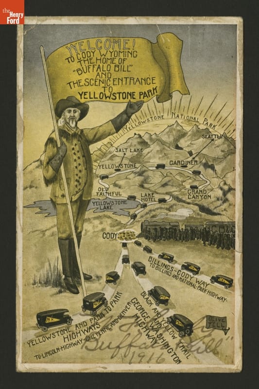 This postcard, sent from Buffalo Bill Cody to Henry Ford in 1916, shows recently created trails bringing motorists to Yellowstone National Park.