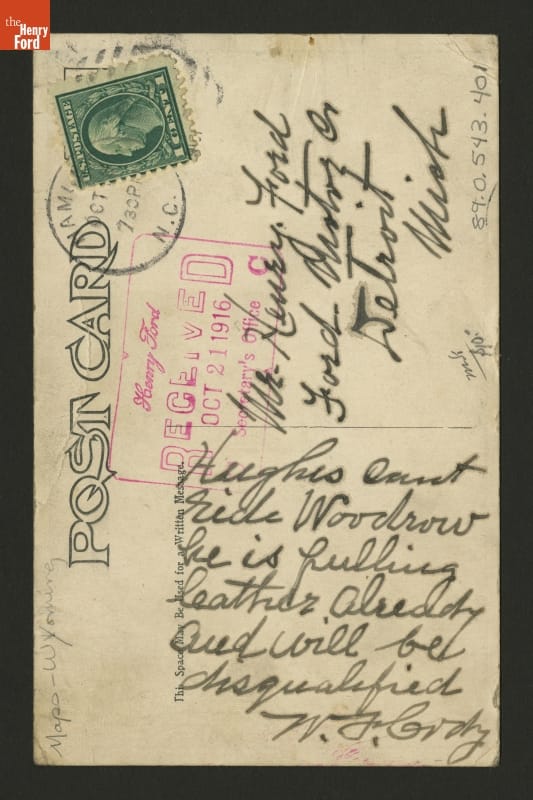 Text on front: WELCOME! / TO CODY WYOMING / THE HOME OF / BUFFALO BILL" / AND / THE SCENIC ENTRANCE / TO / YELLOWSTONE PARK Signed on front, lower edge: Fondly / Buffalo Bill / 1916 Message on back: Hughes can't ride Woodrow he is pulling leather already and will be disquialified W.F. Cody Address on back: Mr. Henry Ford / Ford Motor Co. / Detroit / Mich