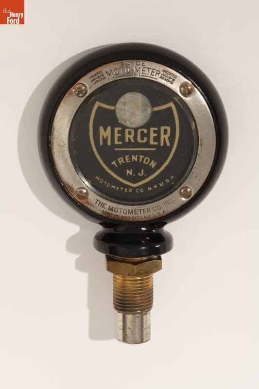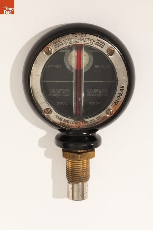 Automobiles often came without temperature gauges before the early 1930s, so enterprising manufacturers sold aftermarket motometers. Mounted on a car's radiator, these devices measured and displayed coolant water vapor temperature, notifying drivers if their automobiles were in danger of overheating. Moto-Meter Co. Inc. dominated the American market, producing the popular Boyce motometer and others featuring an automotive manufacturer's name or logo.
