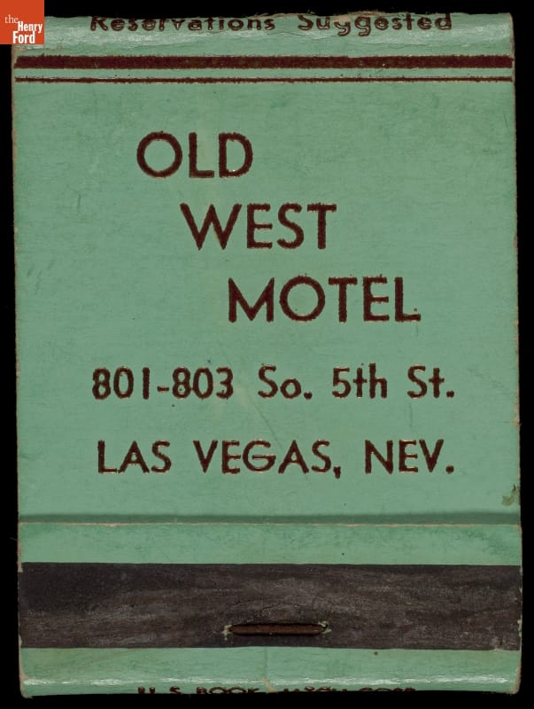Motel advertisements on small give away items reminded travelers of their stay. Forgetful travelers to the Old West Motel could remember the name of the motel by looking at one side of the matchbook. And then turn it over to remember that they had "Lots of Fun! at Las Vegas."