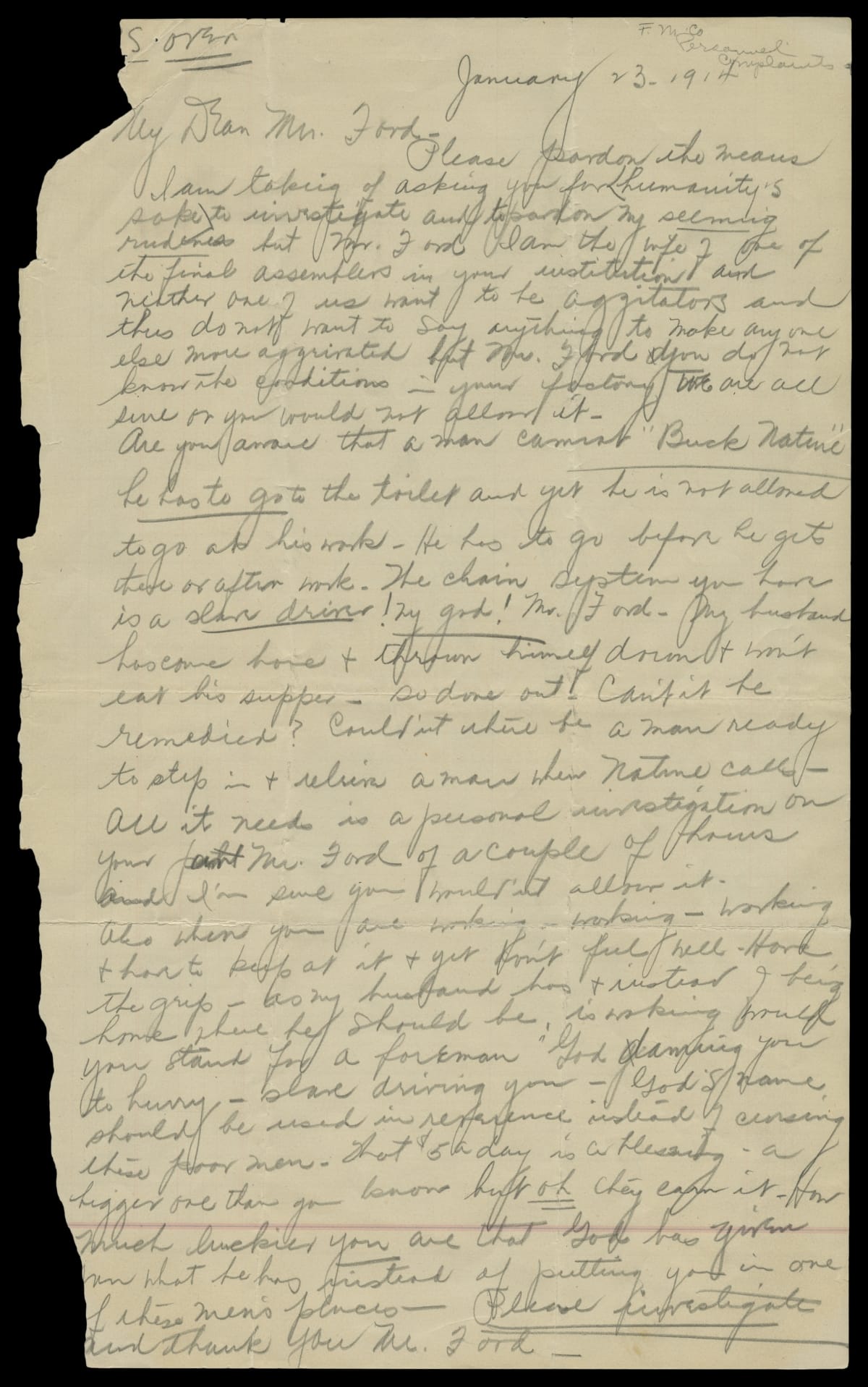 Please pardon the means I am taking of asking you for humanity's sake to investigate and to pardon my seeming rudeness but Mr. Ford I am the wife of one of the final assemblers in your institution and neither one of us want to be aggitators [sic] and thus do not want to say anything to make anyone else more aggrivated [sic] but Mr Ford you do not know the conditions in your factory. We are all sure or you would not allow it--