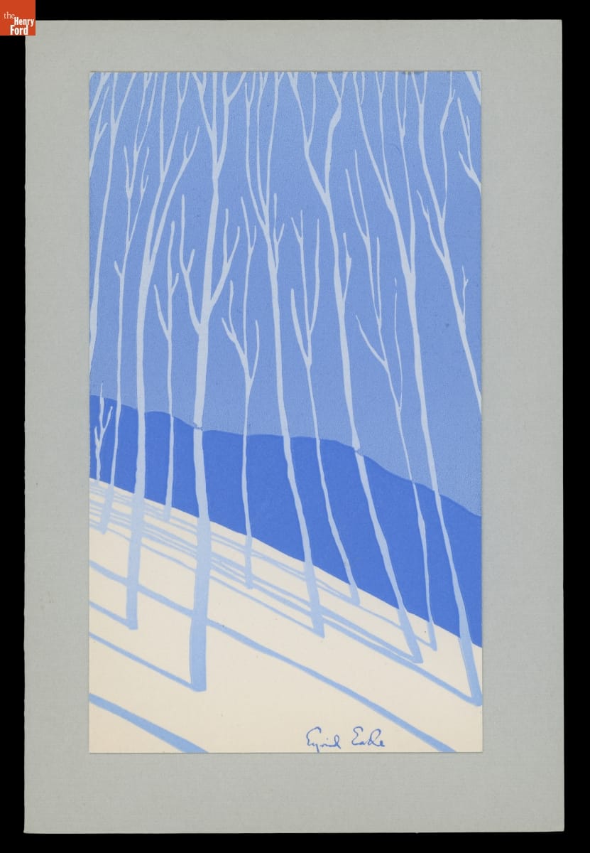 The artist Eyvind Earle (1916-2000) is best known for his work on the 1959 Walt Disney Studios animated film Sleeping Beauty, but he also designed Christmas cards. Earle began producing cards in his early twenties, selling them through his own company. Later, Earle joined the American Artists Group and continued designing Christmas cards. He would produce more than 800 designs throughout his career.