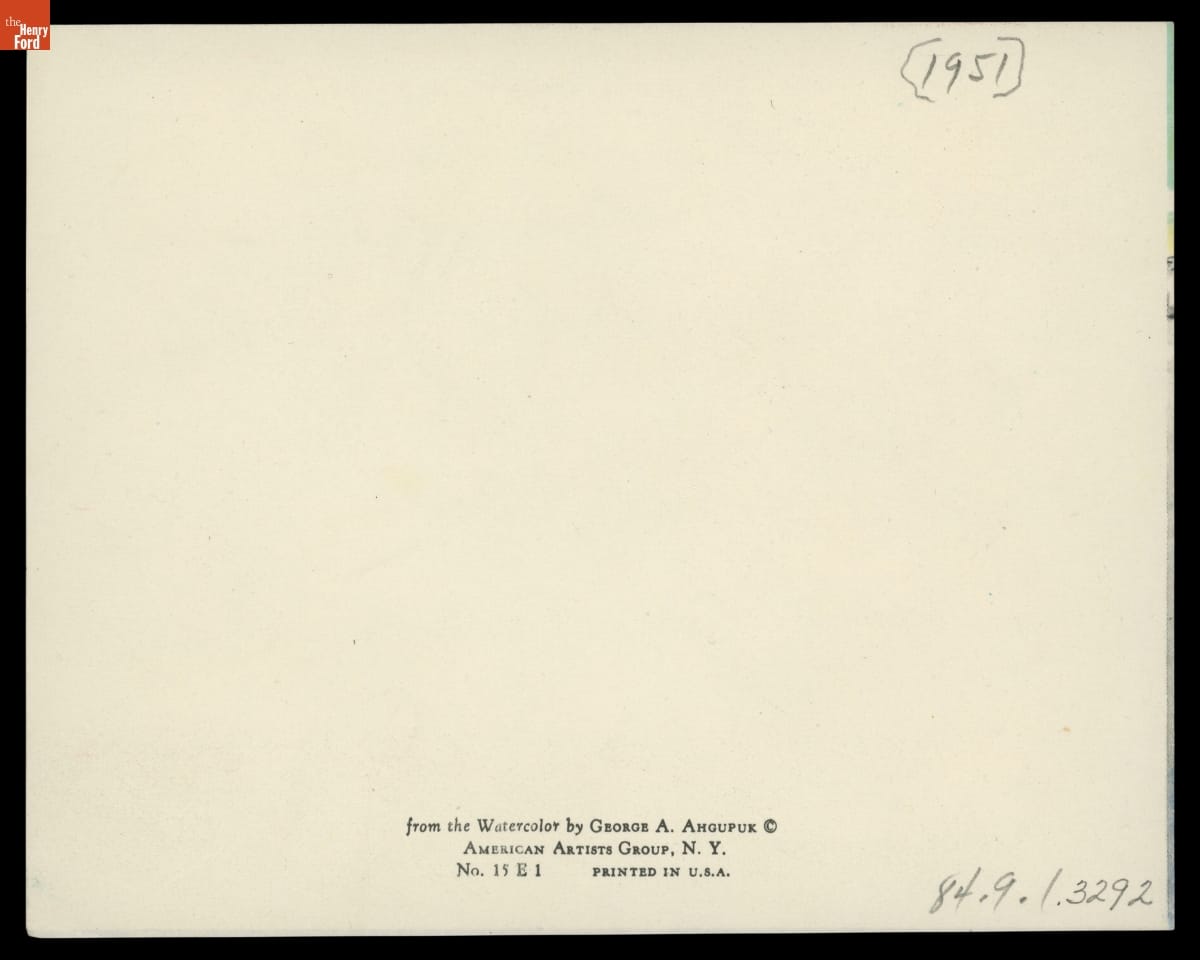 George Twok Aden Ahgupuk (1911-2001), an Inupiat artist from Shishmaref, Alaska, began his artistic career during a several-month hospital stay in 1934. Ahgupuk's artwork of Native Alaskan life became widely known years later through a developing friendship with fellow artist and illustrator Rockwell Kent. Kent also encouraged him to illustrate Christmas cards. Ahgupuk did and explored other commercial ventures that documented native life.