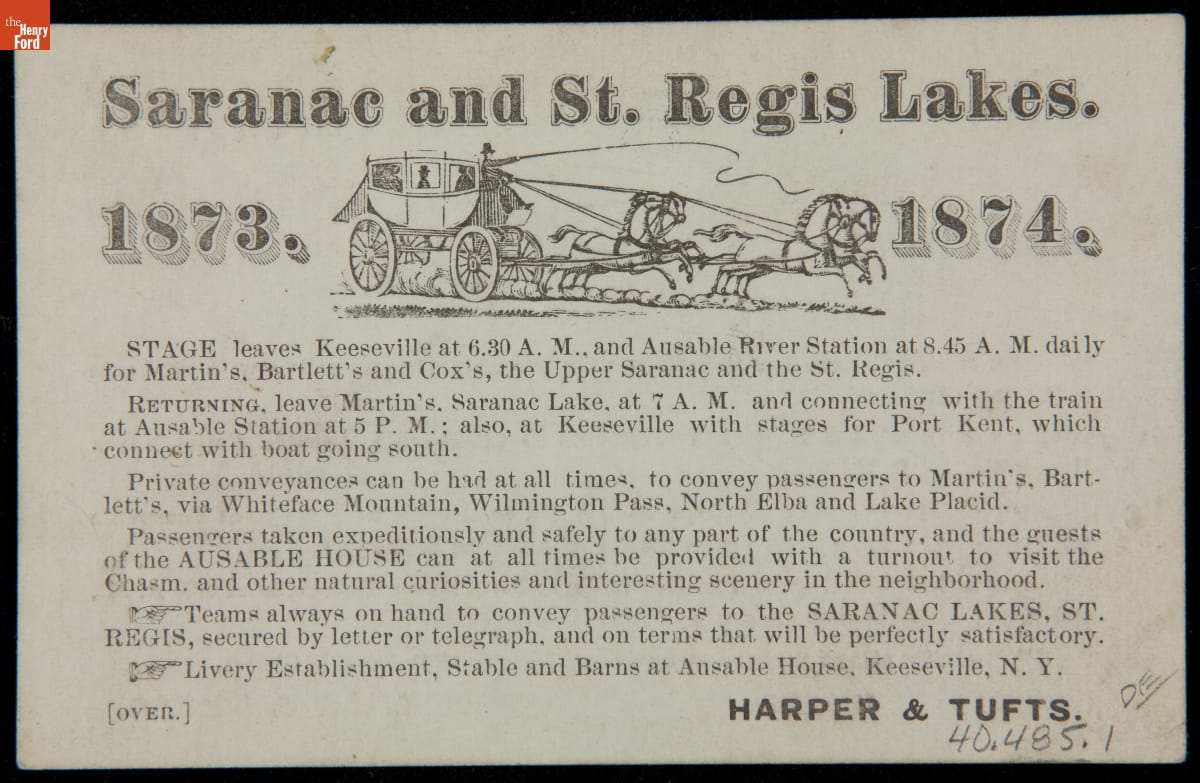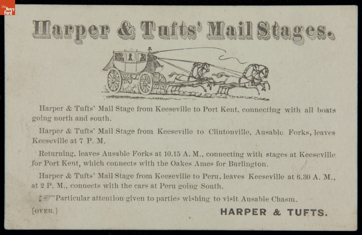 Trade Card for Harper & Tufts' Mail Stages, Adirondacks, New York, 1873-1874