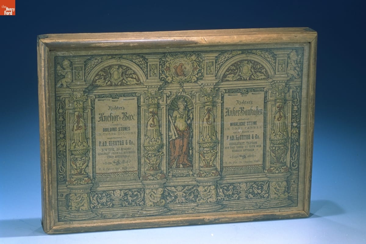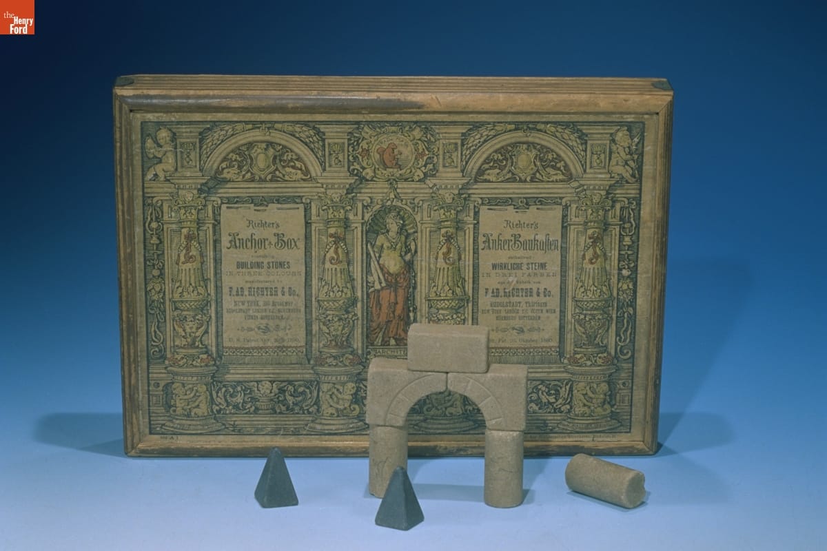 Construction sets were made out of materials popular at that time. This set consists of stone columns, arches, pyramids and triangular, rectangular, and square blocks. Friedrich A. Richter did not invent these stone building blocks, but in 1880, he acquired the production rights and the machines to produce them.