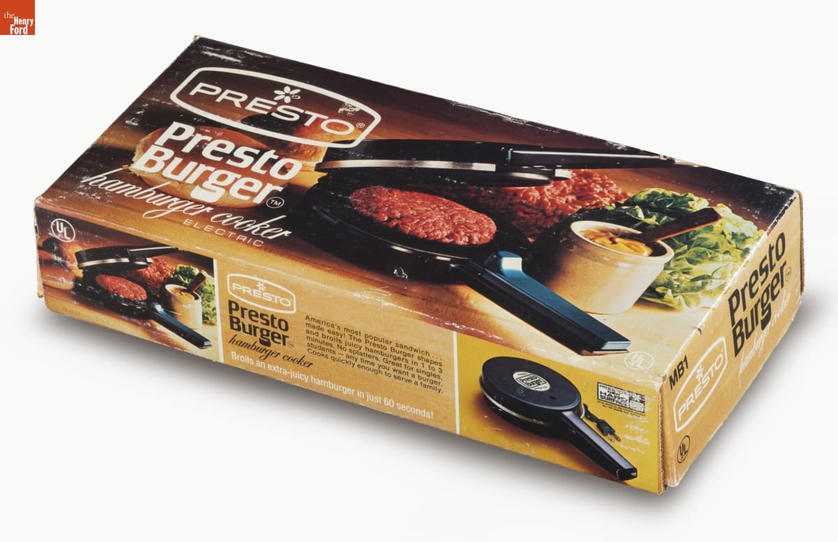 PRESTO / Presto / Burger / hamburger cooker / America's most popular sandwich... / made easy! The Presto Burger shapes / and broils juicy hamburgers in 1 to 3 / minutes. No splatters. Great for singles, / students - any time you want a burger. / Cooks quickly enough to serve a family.