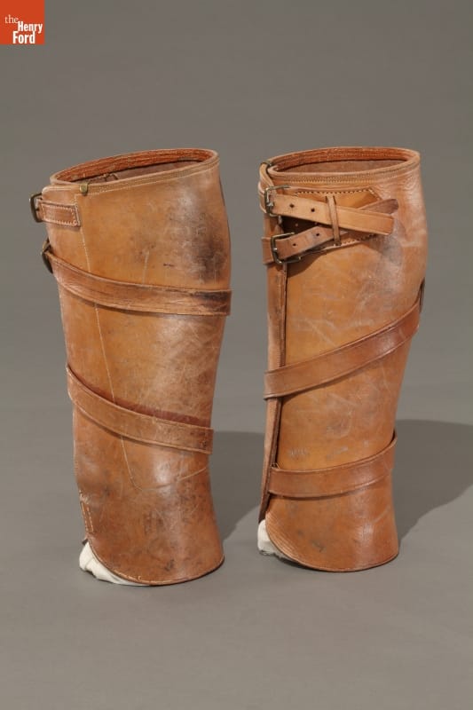 Riding a motorcycle put the operator's legs perilously close to hot surfaces on the engine and exhaust pipe. Leather leggings shielded from burns, and they also offered protection from scrapes and cuts in the event of a fall. This pair of leggings was used by Arthur K. Schwartzbeck of Milwaukee, Wisconsin.