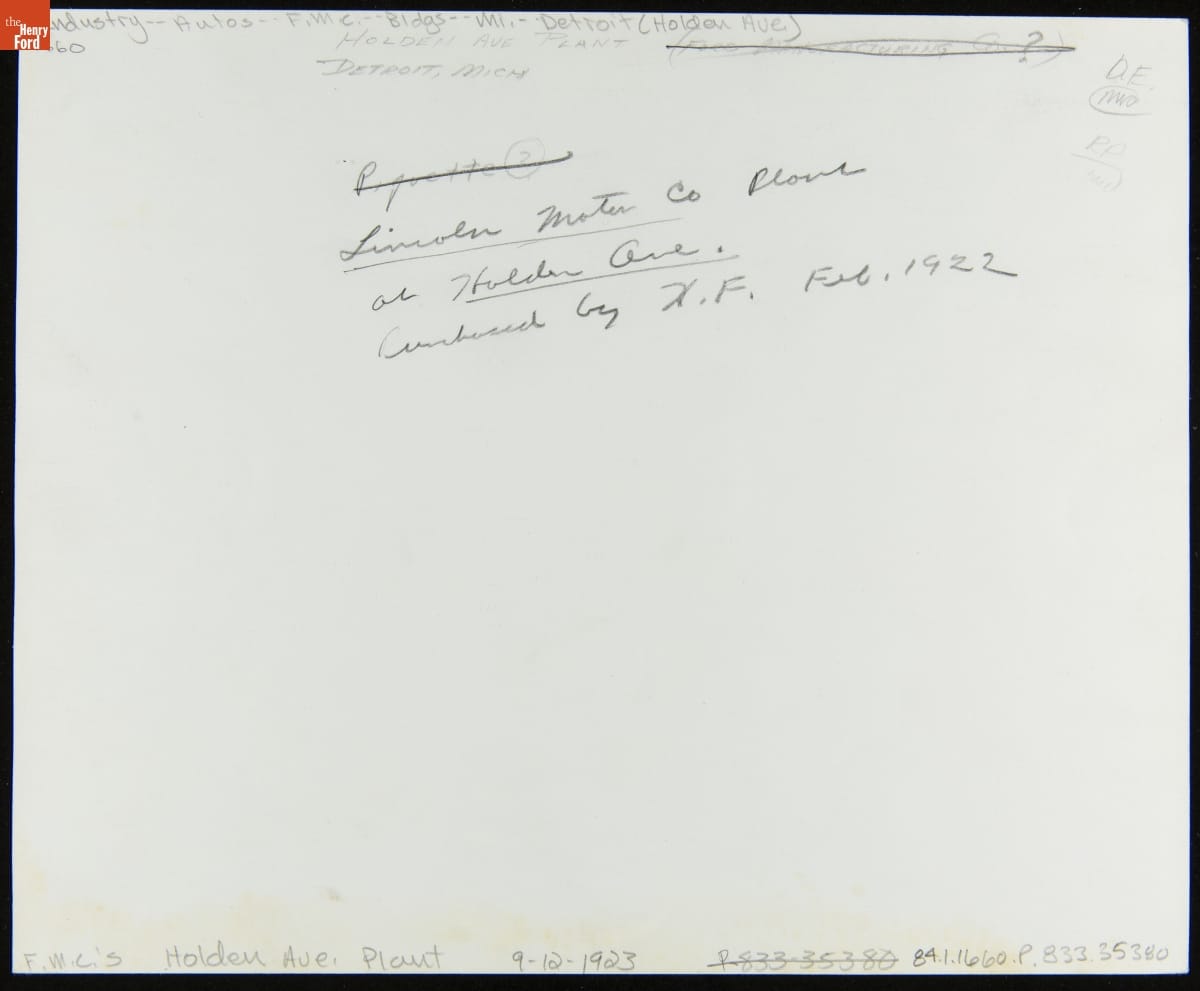 Ford Motor Company's plant on Holden Avenue in Detroit had an interesting history. Warren Motor Car Company built it in 1910. After Warren's bankruptcy in 1913, it was used by Lozier Motor Company, which itself quickly went bankrupt. In 1917, the newly formed Lincoln Motor Company purchased the complex. Ford inherited the facility when it bought Lincoln in 1922.