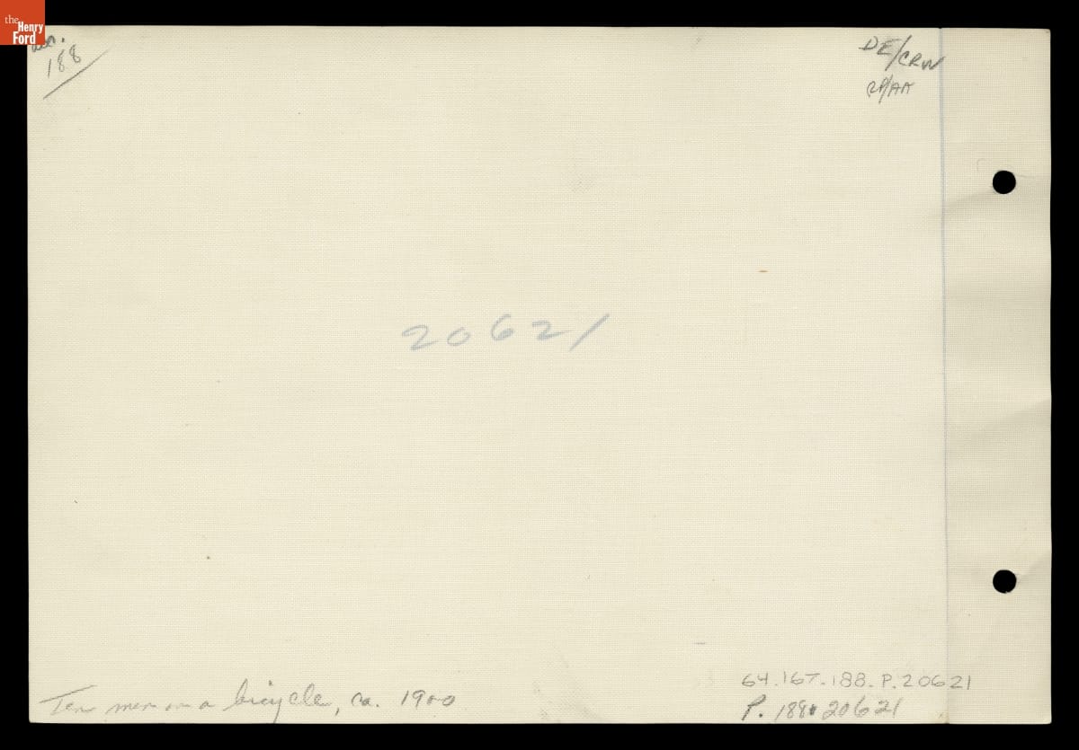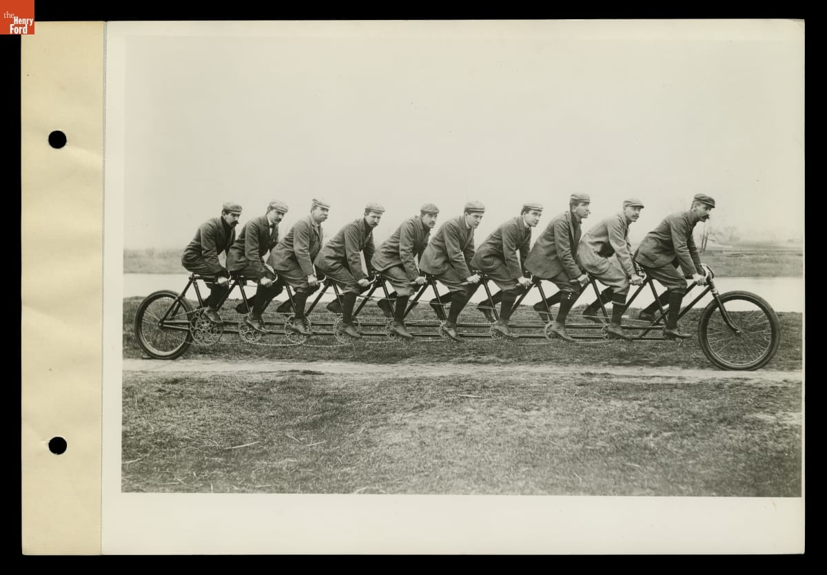 Charles Metz of Waltham, Massachusetts, built the Orient Oriten in 1896 as a way to promote his Orient line of bicycles. Metz featured this 23-foot-long, 305-pound ten-seater at bicycle meets and races throughout the country. The vehicle, though, was difficult to ride. This photograph shows ten men seated on the cycle.